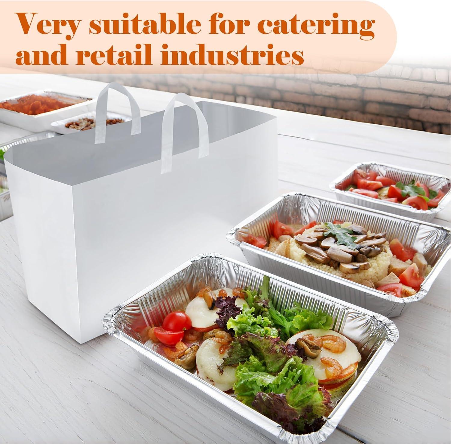 Features: Practical color and design: Style and function go hand in hand with these bulk take out bags. The white color gives a clean, professional look that reflects your brand's attention to quality and freshness, while the soft handles make it easy for your customers to transport their orders with ease. Built for your business: Make food delivery a breeze with our sturdy and stylish take out bags with handles. Specifically designed to suit the needs of your restaurant, these plastic food bags