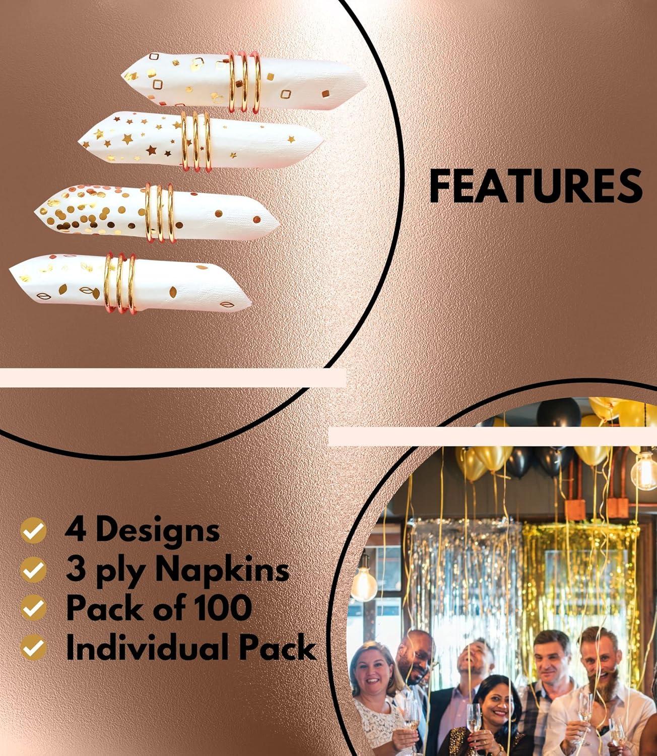 ▐ ░ Chic Design to WOW Your Guests ░▐ If you're looking for classy sparkly design napkins, here you are! Winoo design four different beautiful shimmering gold foil patterns on paper napkins, and they can perfectly coordinate with gold dinner plates, gold cups, and gold utensils, or Winoo paper napkins can just combine with simple white plates on the table, and your guest will be definitely delighted to see the super cute combination. ▐ ░ Premium Quality to Throw a Party ░▐ Nothing cheap and flim