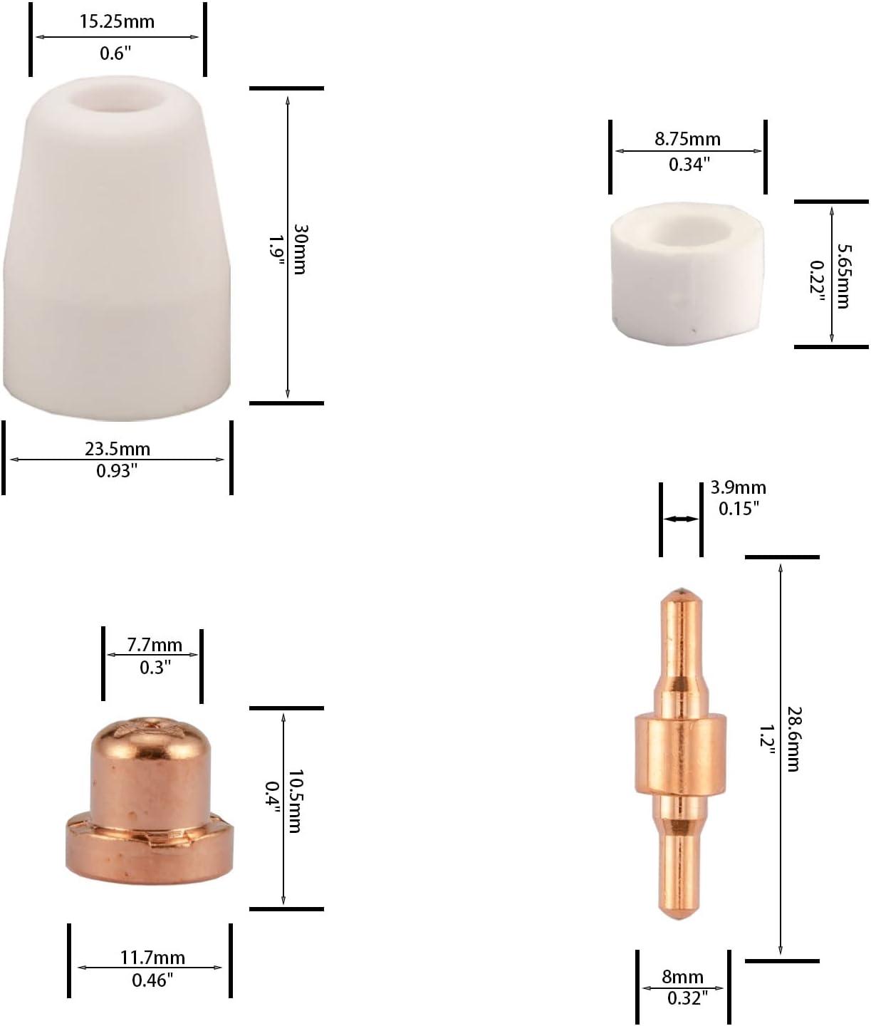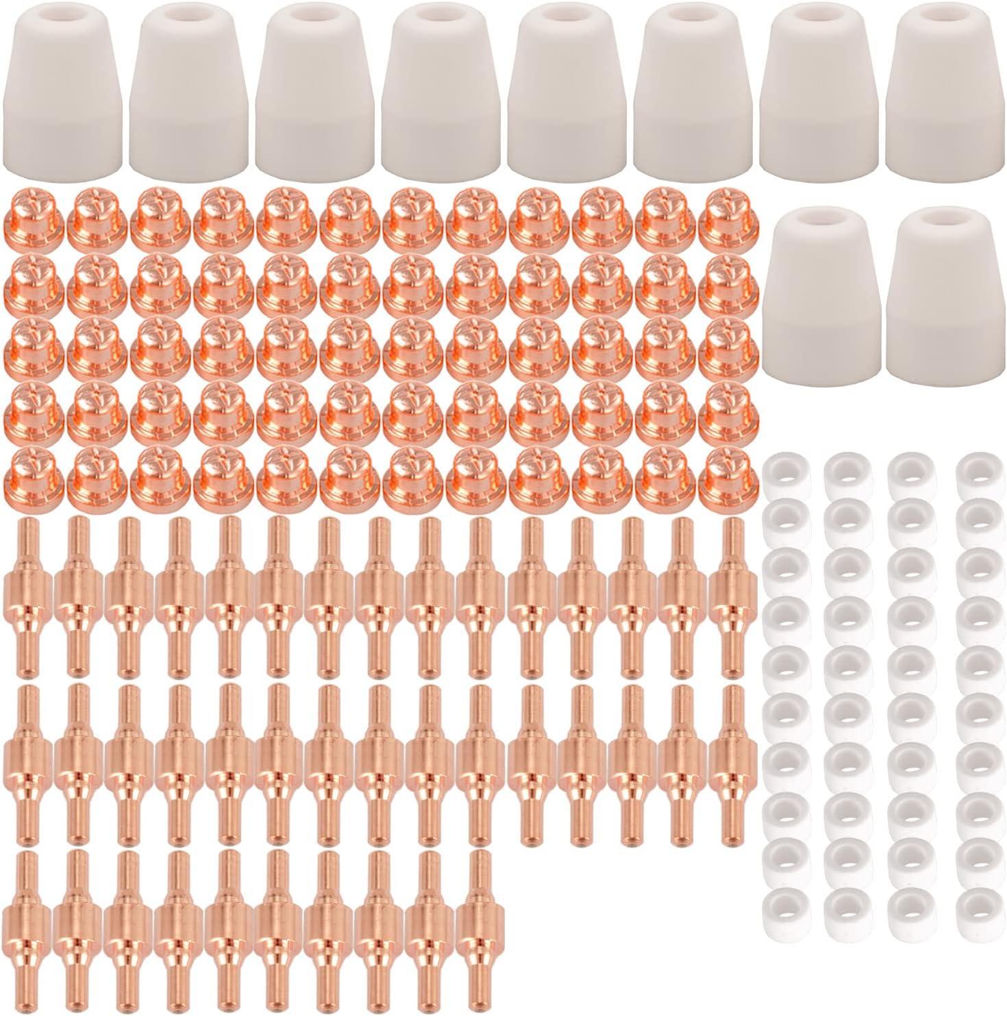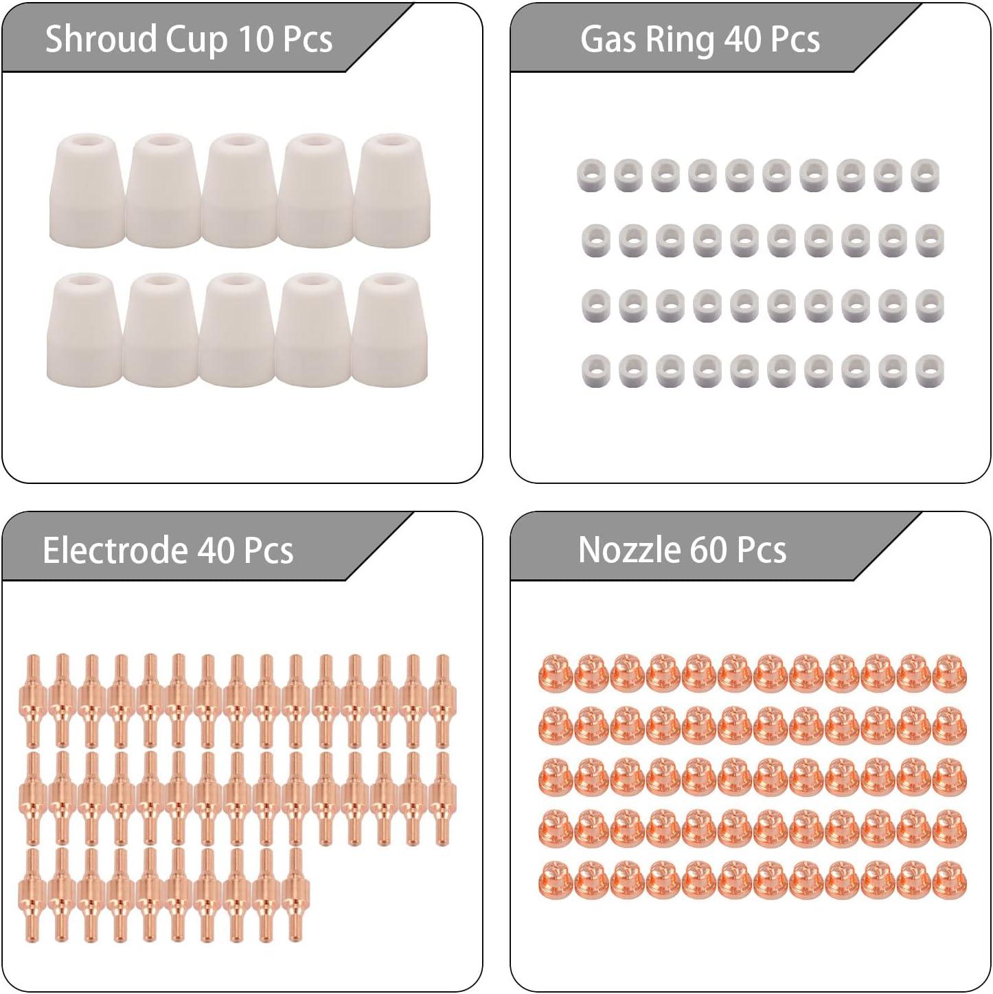 150PCS Plasma cutting consumables Package list: 60pcs Plasma Tips Nozzle Ref No: 18866 40pcs Electrode Ref No:18205 10pcs Shroud Ceramic Cup Ref No: 18204 40pcs Gas Ring No: 18785Fit PT-31 JG-40 & WSD-40 Cutting Torch; Cutting Torch suitable for the use of 40 50A current under high frequency plasma cutting machine, cutting 12MM following iron; The Brand of Machine would be Rilon, Riland, Jasic, Mitech, Chiry, UNT, Krypton, Longetivity, Berlan etc;