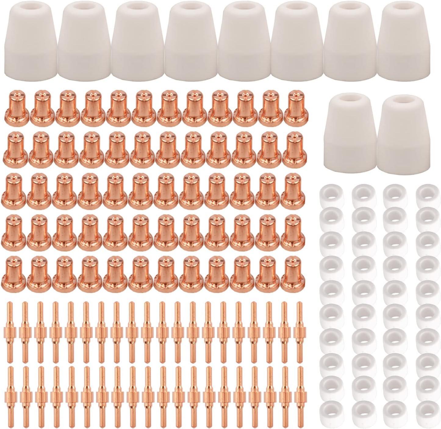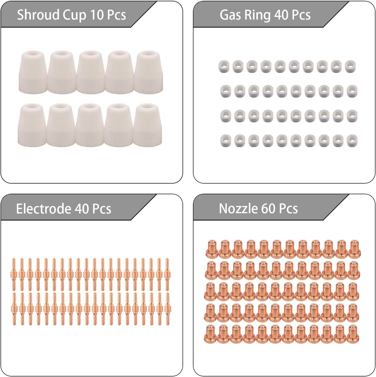 150PCS Plasma cutting consumables Package list: 60pcs Plasma Tips Nozzle Extended Ref No: 18866L 40pcs Electrode- Extended Ref No:18205L 10pcs Shroud Ceramic Cup Ref No: 18204 40pcs Gas Ring No: 18785 Fit PT-31 JG-40 and WSD-40 Cutting Torch; Cutting Torch suitable for the use of 40 50A current under high frequency plasma cutting machine, cutting 12MM following iron; The Brand of Machine would be Rilon, Riland, Jasic, Mitech, Chiry, UNT, Krypton, Longetivity, Berlan etc;