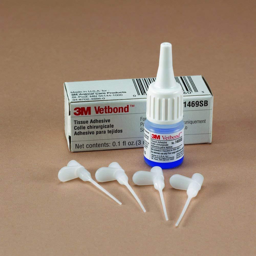 3M Vetbond Tissue hesive is a fast-acting, veterinary-gre liquid glue that quickly seals minor wounds on animals. This 0.1 oz (3 mL) blue-tinted hesive forms a strong bond in seconds, often eliminating the need for tritional bandages or even sutures on small cuts. Strong & Fast Bonding: Utilizes a medical-gre N-butyl cyanoacrylate formula that polymerizes rapidly upon contact with tissue. It creates an instant, durable bond that holds wound edges together, helping injuries heal quickly and clean