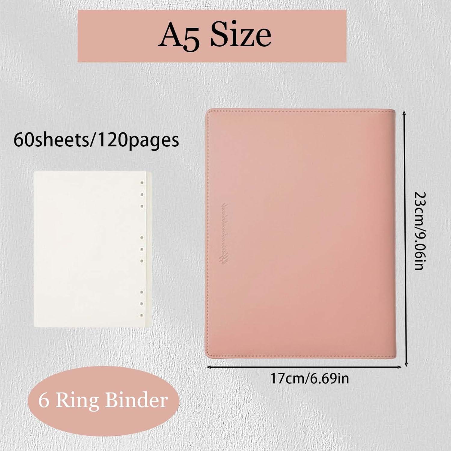 A5 PU Leather Binder Cover, 6 Ring Loose Leaf Notebook with 60 Sheets Blank Dowling Paper, Refillable Round Ring A5 Binder for School Supplies, Meeting Records, Budget Notebook Folder(Pink)