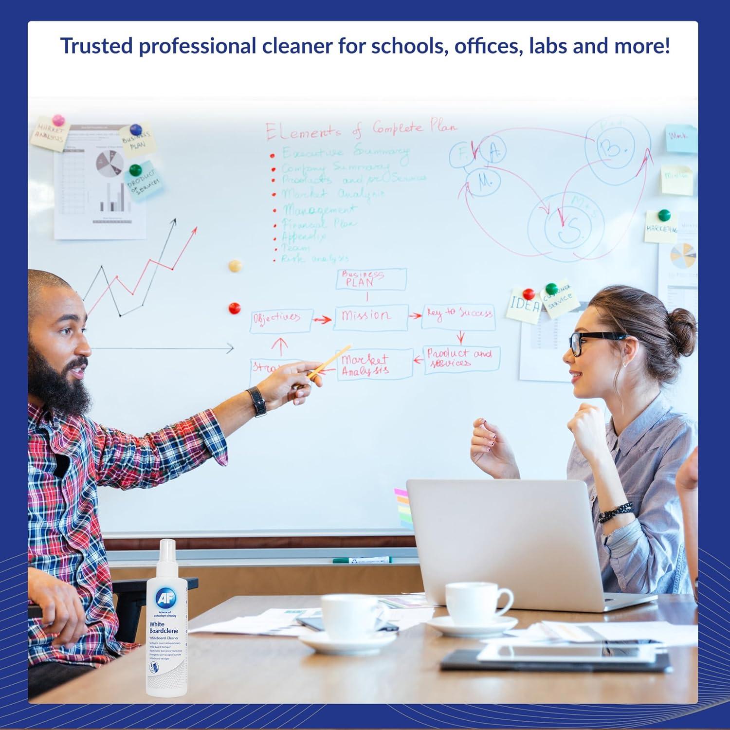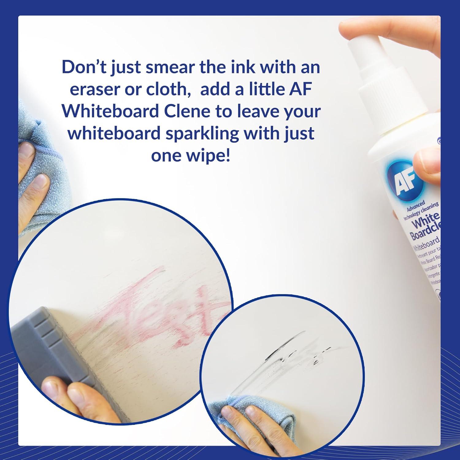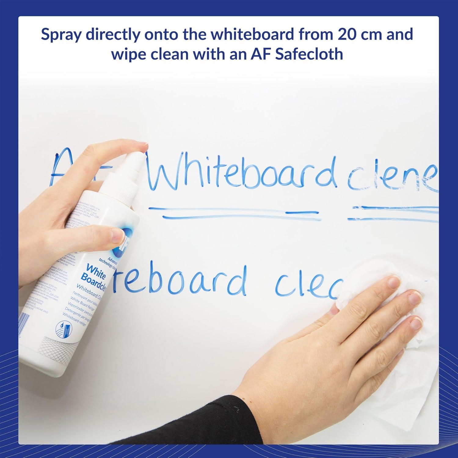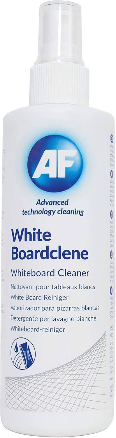 A non-aerosolized non-flammable pump spray to effectively remove dry ink and grease residues from whiteboards. Properties: the means for perfect cleaning of whiteboard work surfaces pleasant citrus aroma reduces hesion of dust particles (antistatic effect) extends surface life regular use is recommended procedure: apply and wipe with a sponge harmless to health, non-flammable capacity 250 ml Manufacturer introduction: AF International is a leing European manufacturer of PC cleaning products, off