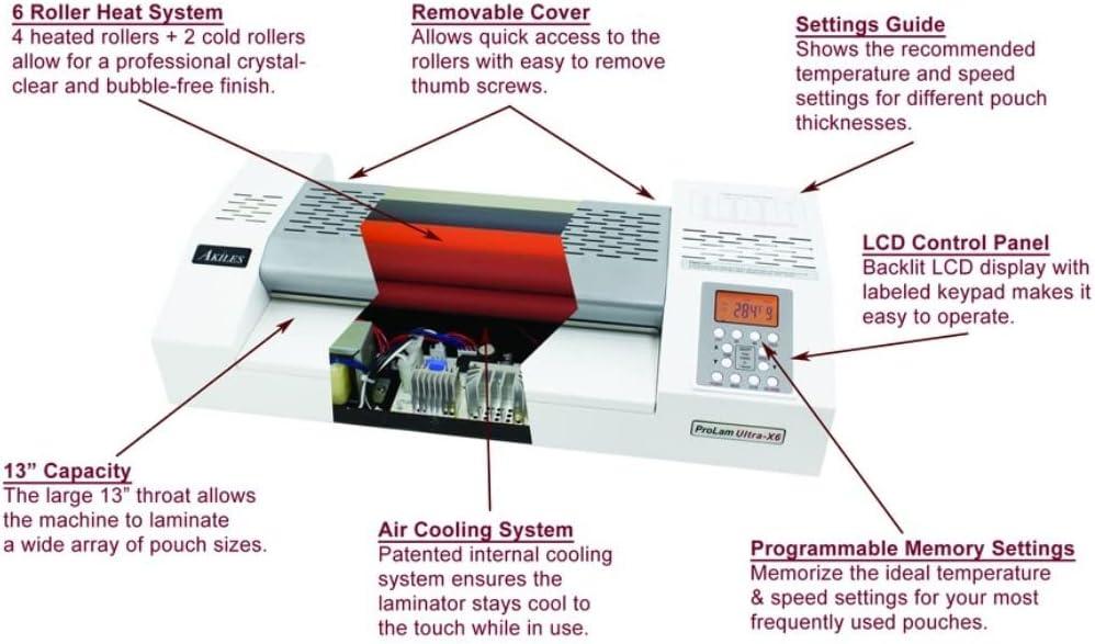Akiles APLULTRA-X6 Model ProLam Ultra-X6 Commercial Gre 6 Roller Laminator with 2 Programmable Memory Settings, 13" (330 mm) Throat Capacity, 14 mil (350 mic) Max Pouch Thickness Key Features - Programmable Memory Settings: Allows you to save the ideal temperature and speed for your most frequent projects - 6 Roller Heat System: The 4 heated rollers + 2 cold rollers guarantee professional gre results and crystal clear lamination - Auto Shutoff: Automatically cools and shuts down the machine afte