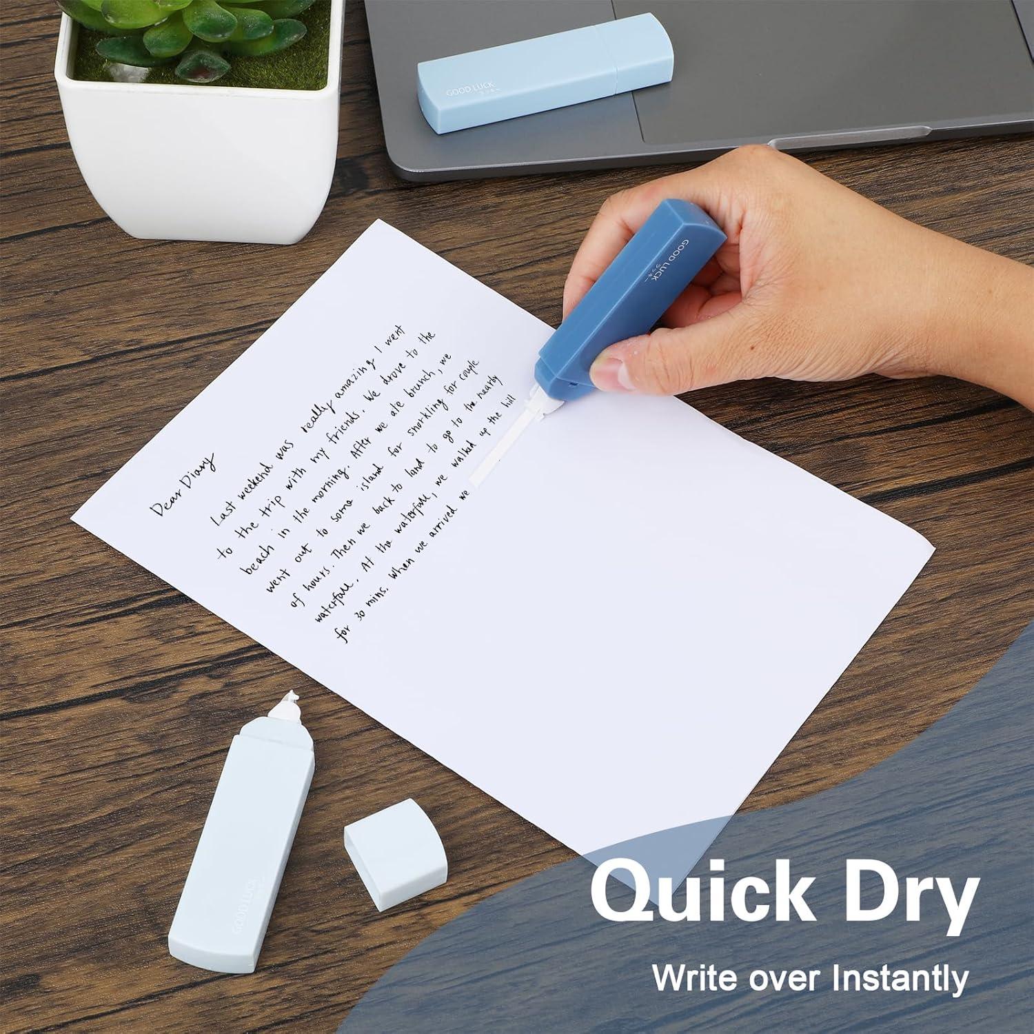- Quick Dry: Our whiteout roller dries quickly, so you don't have to wait too long. Perfect for correcting handwriting like ballpoint pens, gels, and inks, It's your must-have office helper, and easily and conveniently corrects your small mistakes in homework. These tape pens are fast and clean, and allow you to rewrite with a ballpoint pen, ink pen, or gel pen, without damage to papers or documents.