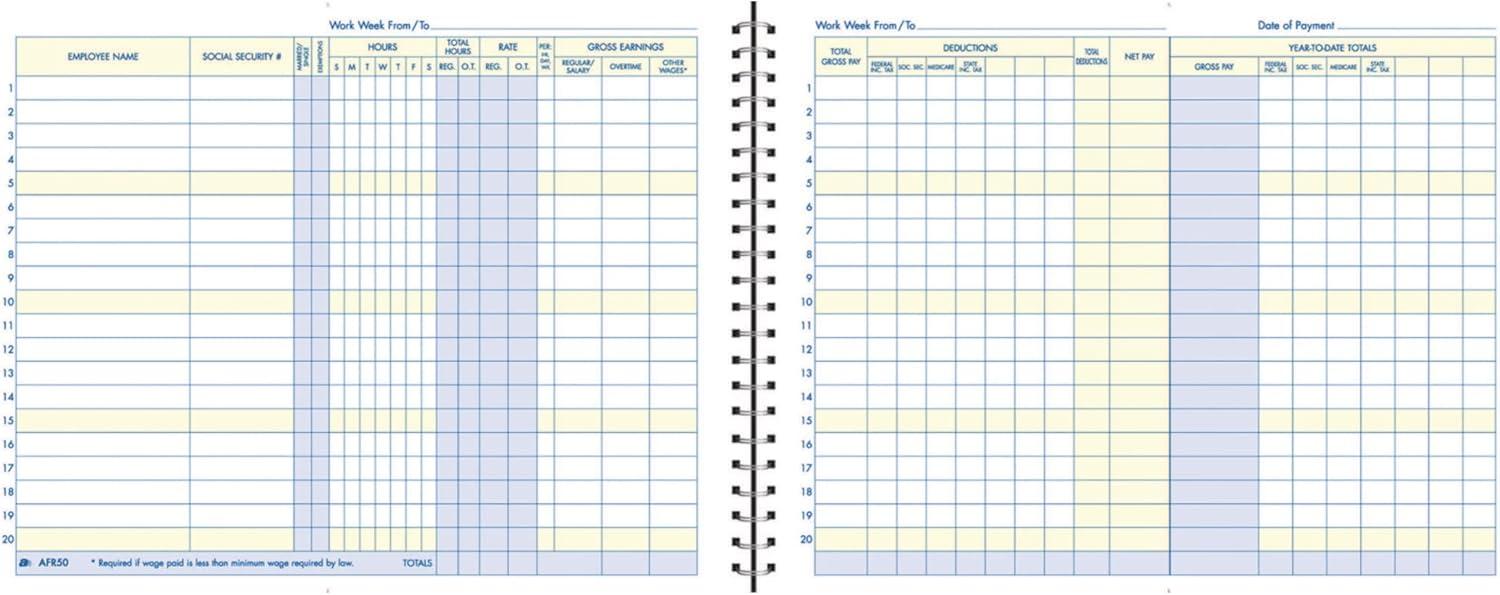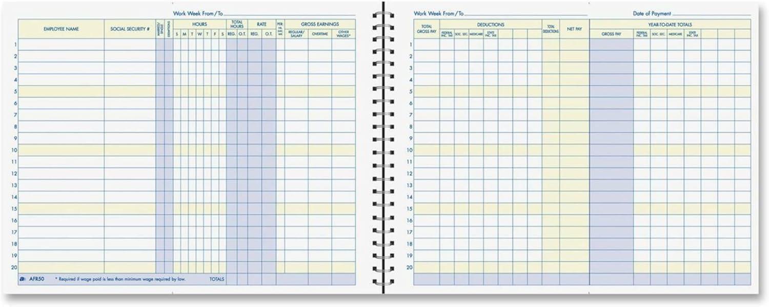 ams Business Forms provide the tools to help keep track of messages, finances, transactions, employees, taxes, and customers to businesses throughout the world. These products are the perfect way to create and maintain a professional image for small businesses and service providers. The ams Weekly Payroll Record tracks weekly hours, pay rates, taxes and other deductions for up to 20 employees. The special Wire-o spiral binding allows book to lay flat so rows line up across the non-dated pages. T