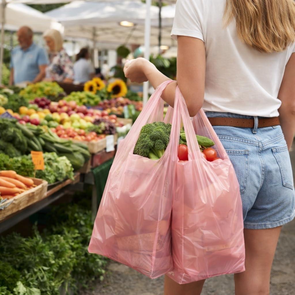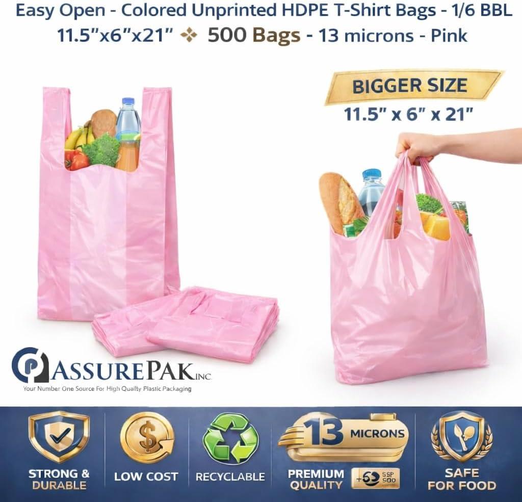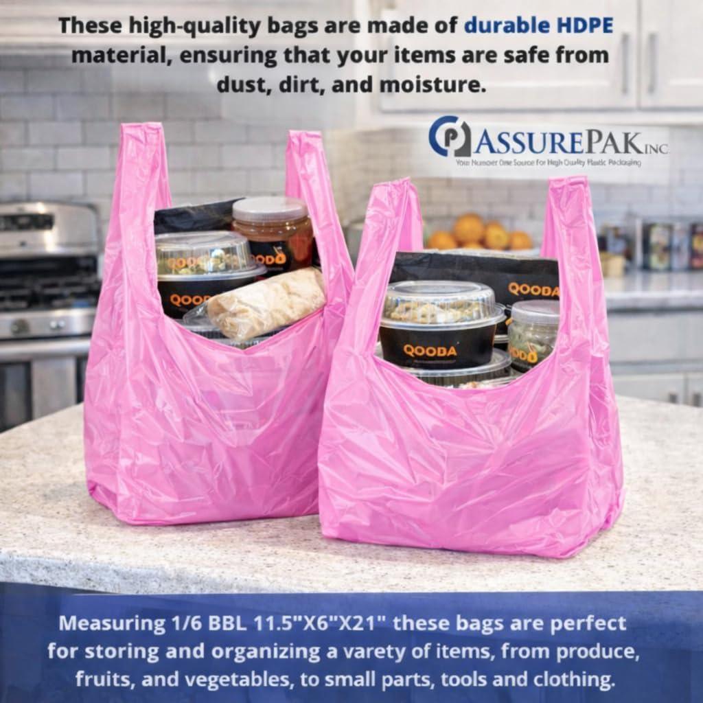 Pink HDPE T-Shirt Plastic Bags for Retail, Groceries, Merchandise, Convenience Store, Supermarket, Restaurant - 1/6 BBL, 11.5"X6"X21" - Pack of 500 Bags, 13 Microns - Unprinted (Pink)