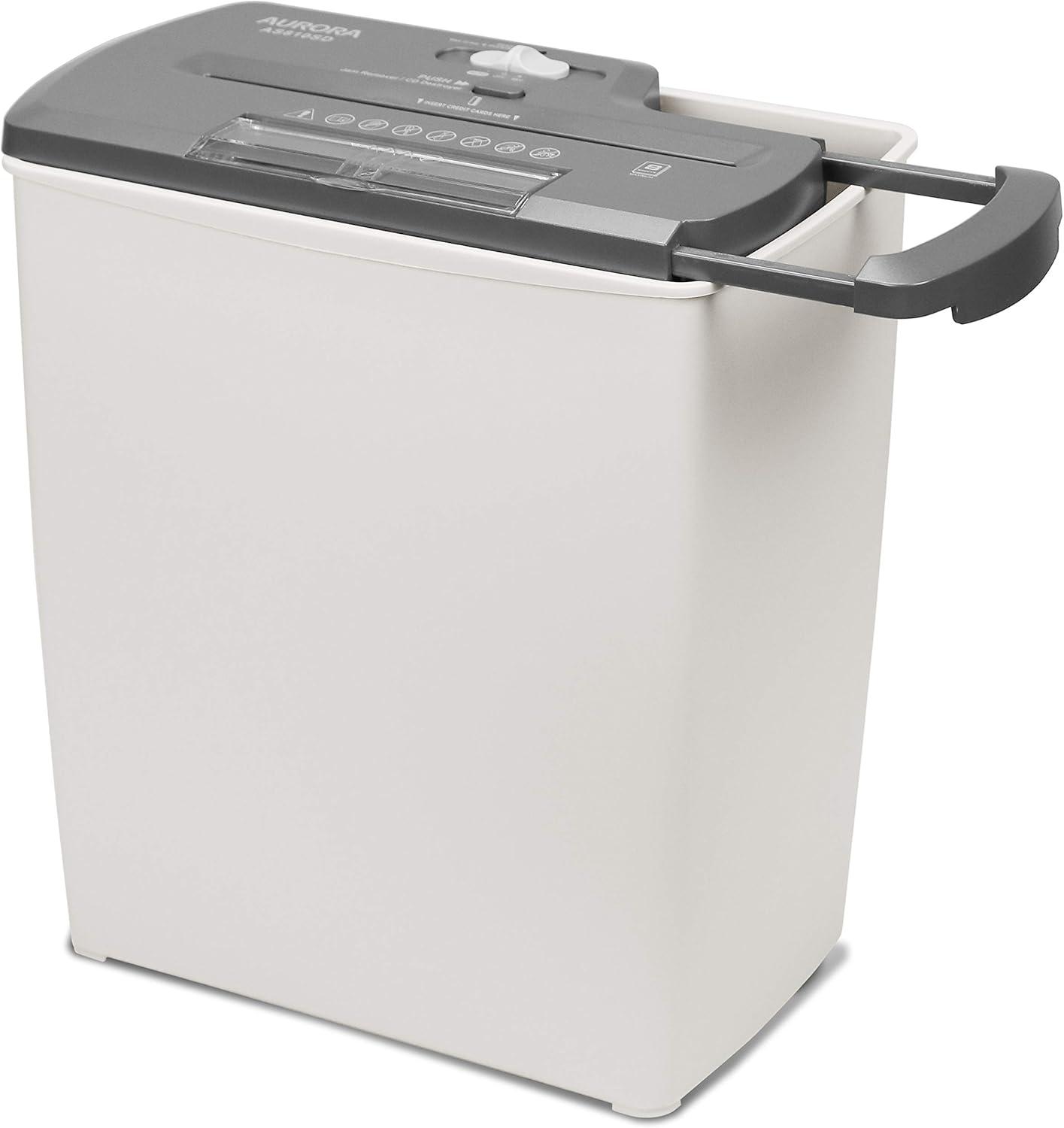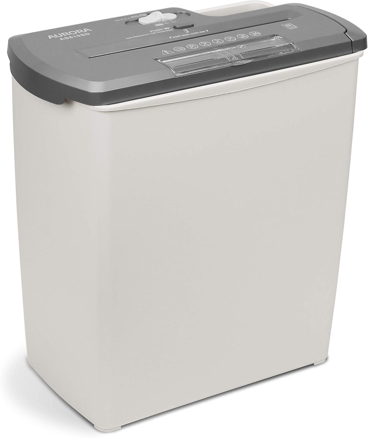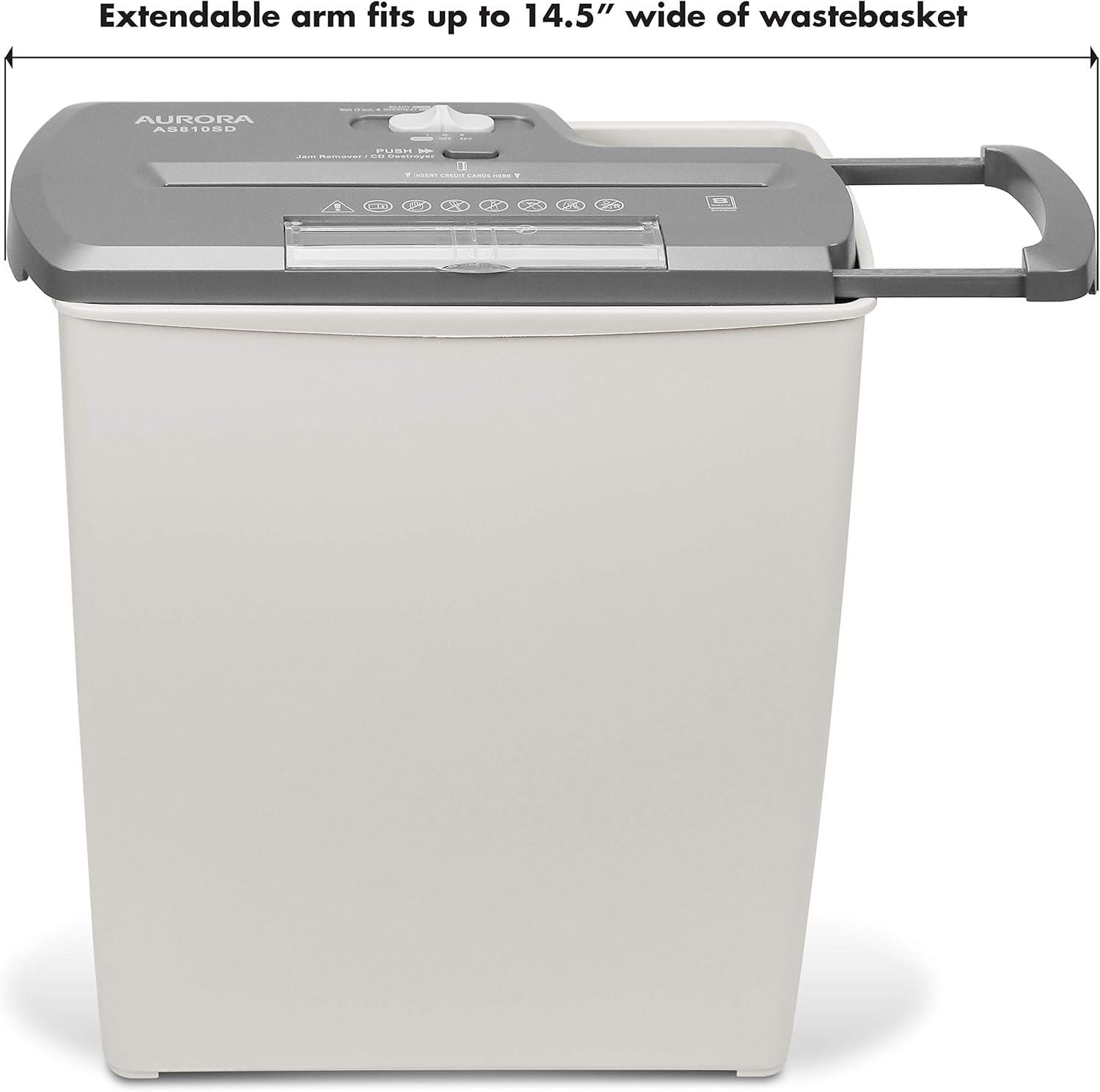 Product Description The Aurora AS810SD 8-Sheet Strip Cut Paper/CD/Credit Card Shredder with Basket is the perfect home device to help keep you safe from identity theft. The AS810SD accepts up to eight sheets of paper at a time and shreds them into 1/4-inch strips. Paper is shredded at a speedy 9.7 feet per minute. A three-mode safety switch keeps your fingers from getting caught. To get the shredding started, simply feed paper through and the shredder auto starts. In dition to paper, the AS810SD