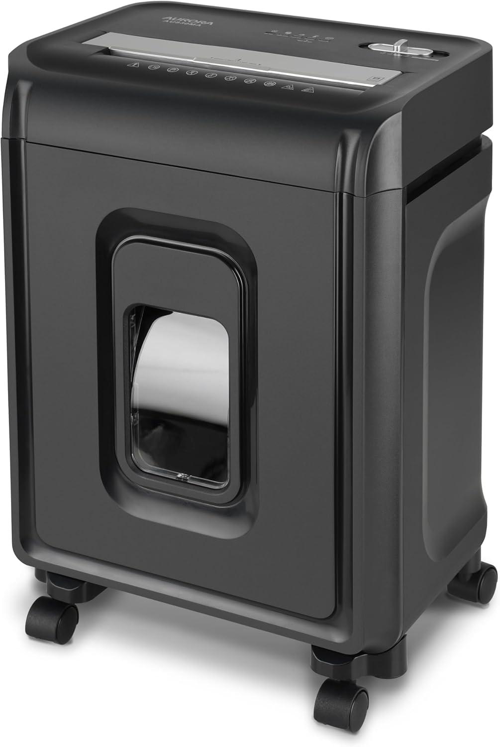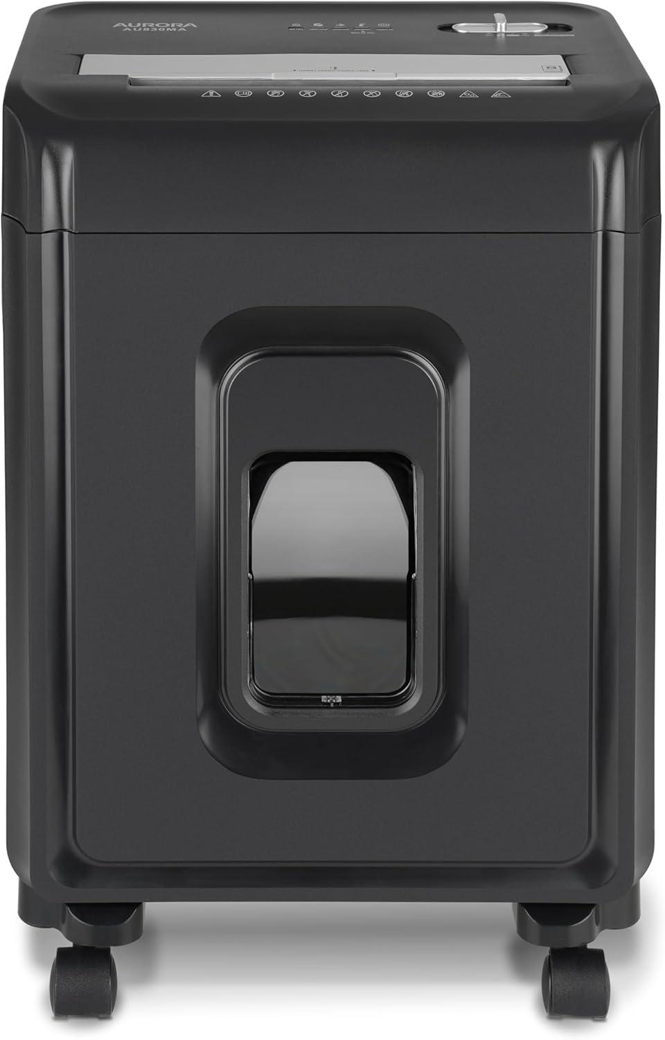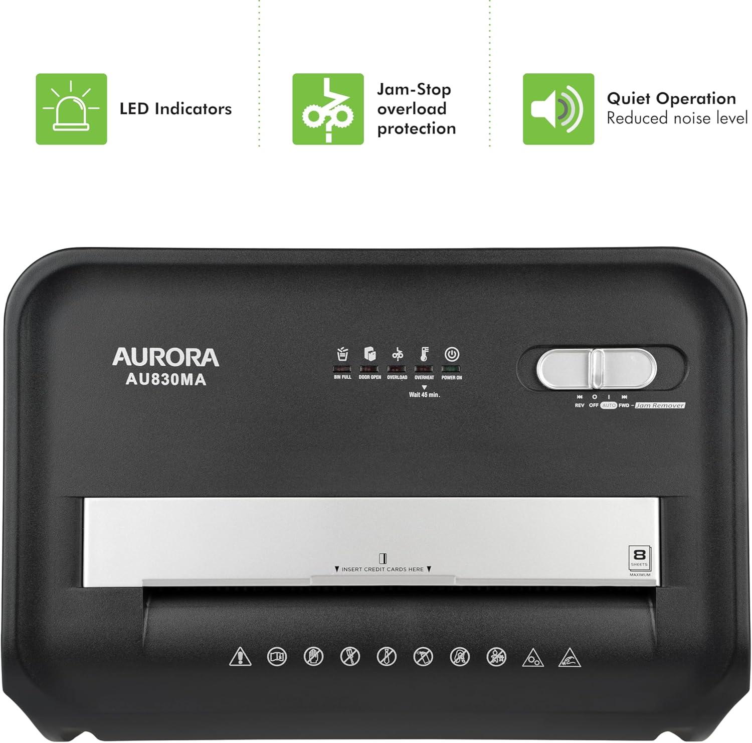 The Aurora AU830MA 8-sheet micro-cut paper/ credit card shredder with a 4-gallon pullout basket is the perfect business and home office device to keep you safe from identity theft. The AU830MA accepts up to 8 sheets of paper at a time and shreds them into small pieces (3/32 by 15/32 inches), security level P-5. Product Dimensions: 12.95" W x 8.9" L x 19.49" H Item Weight: 24.50 pounds Shipping Weight: 27.56 pounds Item model number: AU830MA