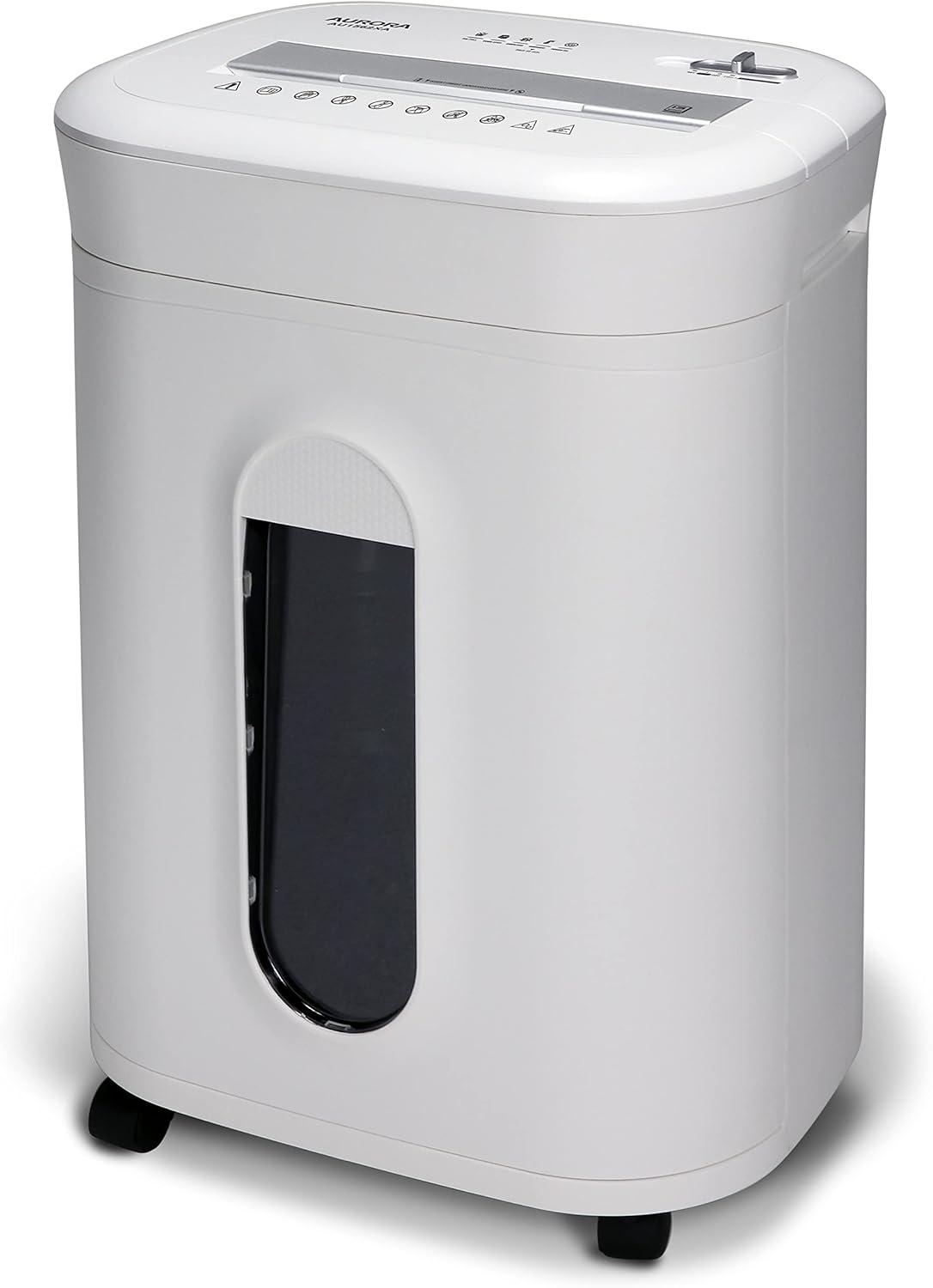 The Aurora AU1562XA 15-sheet crosscut paper/ CD/ credit card shredder with a 6.0-gallon pullout basket is the perfect business and home office device to protect you from identity theft. The AU1562XA accepts up to 15 sheets of paper at a time and shreds them into small pieces (5/32 by 1-7/32 inches), security level P-4. In dition to paper, the AU1562XA shreds CDs/DVDs/credit cards, keeping vital information from falling into the wrong hands. The throat of the shredder is 8.7 inches wide and has c