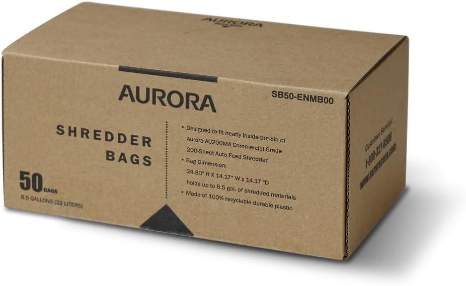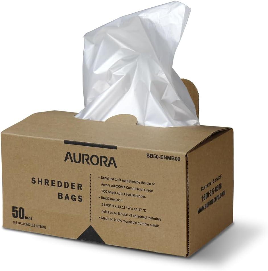 Aurora SB50 shredder waste bags are designed to fit Aurora AU200MA and AU220MB shredder wastebaskets. With an 8.5-gallon capacity, the shredder waste bags can keep your work area clean and make it easy to collect shredded materials from the shredder. 100% recyclable material. The box contains one roll with 50 bags. Item Dimension: 7.28” D x 3.66” W x 3.66” H Item Weight: 2.09 pounds Shipping Weight: 2.27 pounds Item Model Number: SB50