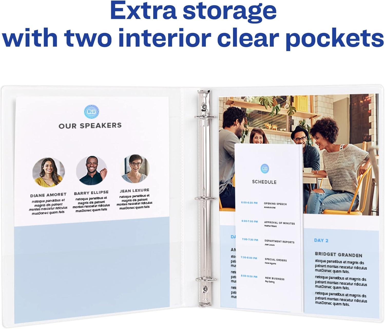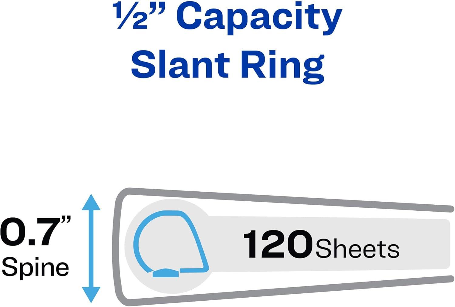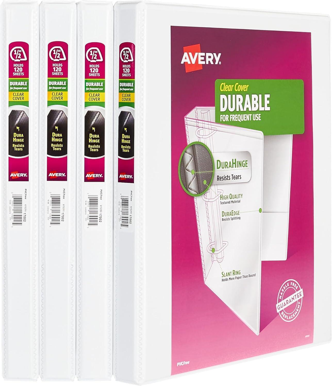 The Avery Durable View 3 Ring Binder is an essential for home organization, office needs, or school supplies. This set of 4 binders is great for those seeking binders capable of handling extensive paperwork. Each binder features 0.5-inch slant rings, accommodating up to 135 sheets, making them ideal for a variety of tasks, whether as a wedding planning book and organizer or a school organizer. The tear-resistant DuraHinge spine and DuraEdge split-resistant edges offer durability beyond standard