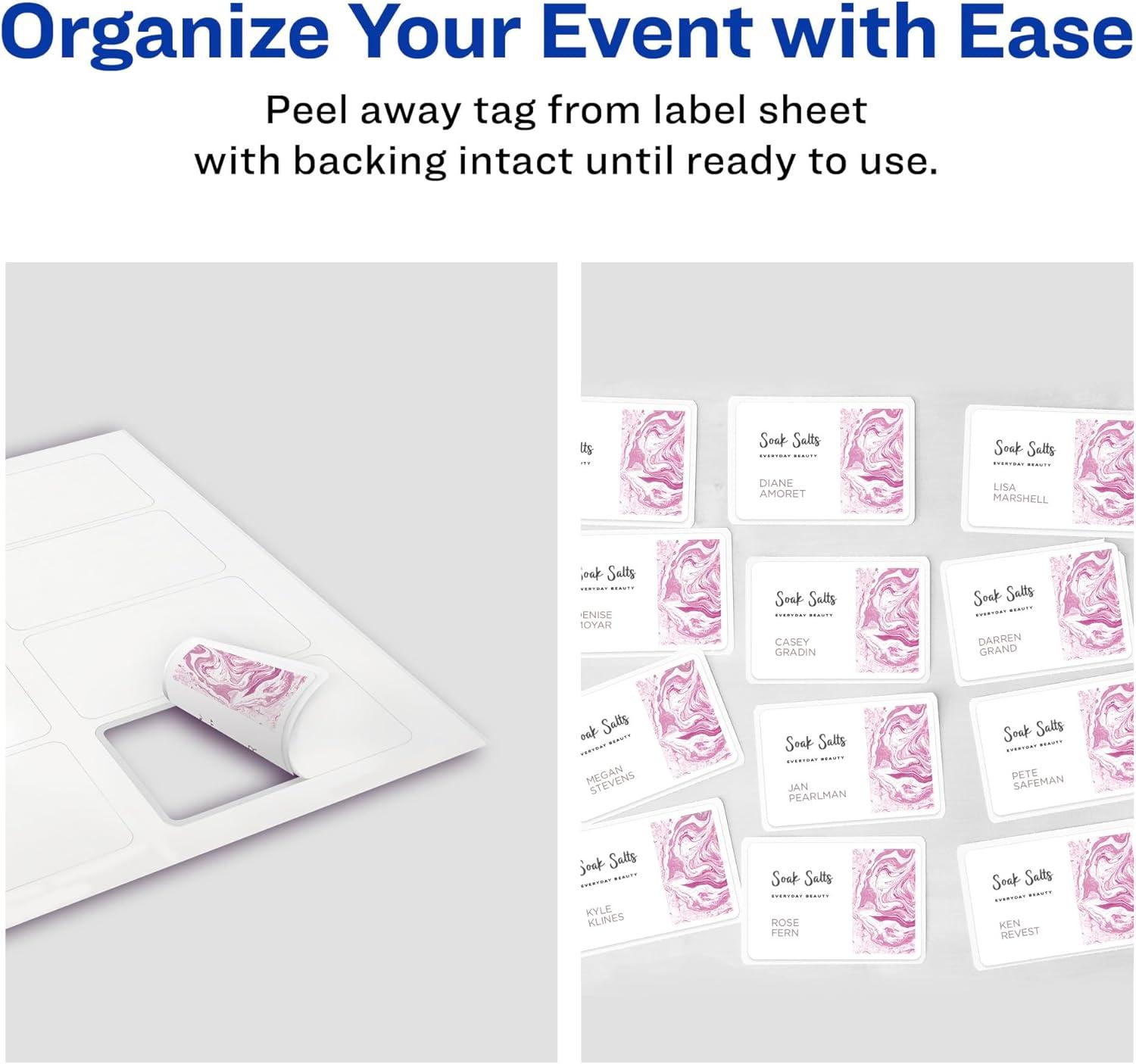 Create personalized name tags that last with Avery 08395 Flexible hesive Name Bges. These superior 2-1/3? x 3-3/8? sticker name tags move with your clothing, making them the perfect name tag labels for all-day events. Save time when preparing for events with the innovative Peel-Away design that makes it easy to separate each hesive name tag from the 8.5? x 11? sheet, while the individual label backing remains intact until rey to use. Removable hesive heres firmly to most fabrics without curling,