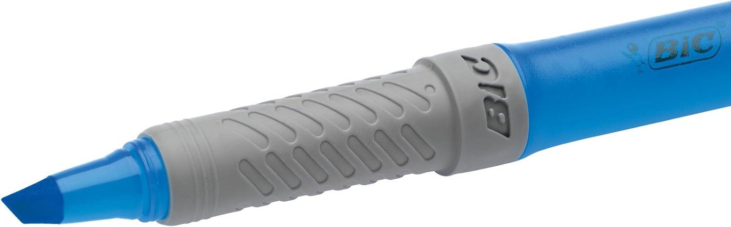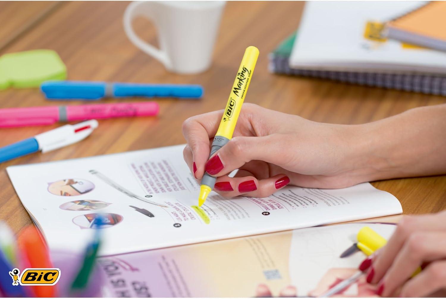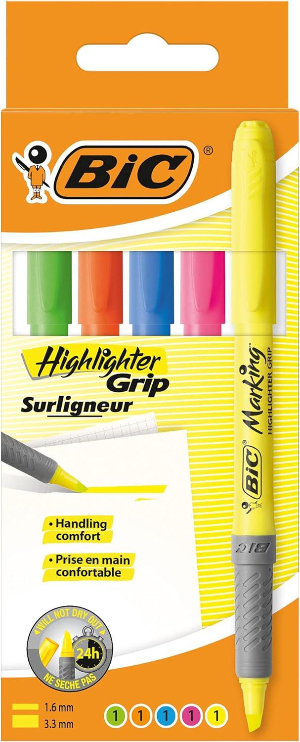 Get straight to the main idea with the Bic highlighter grip pen. This wallet contains 5 highlighters in yellow, pink, green, blue and orange. It's simple and gets the job done, so all the most important information shines through. Never miss that crucial note or a special date in your agenda. This fluorescent highlighter pen has a ribbed rubber grip for extra comfort that helps prevent writer's cramp. Whether in the office, The classroom or at home, use these fluorescent colours to create a dyna