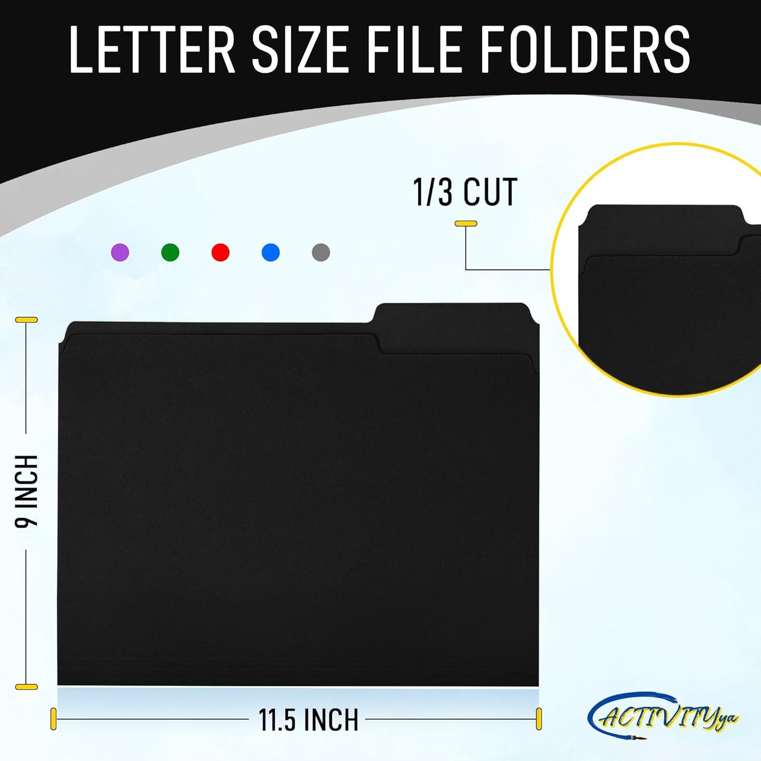 Organize Your Documents with Confidence Keep your workspace tidy and your important papers in order with our premium black file folders. Crafted from durable material, these folders are built to withstand everyday wear and tear, ensuring your documents remain safe and secure. Ideal for home, office, or school use, these folders make it easy to manage your files efficiently. Convenient 1/3-Cut Tabs for Easy Labeling Our file folders feature 1/3-cut tabs in assorted positions, providing ample spac