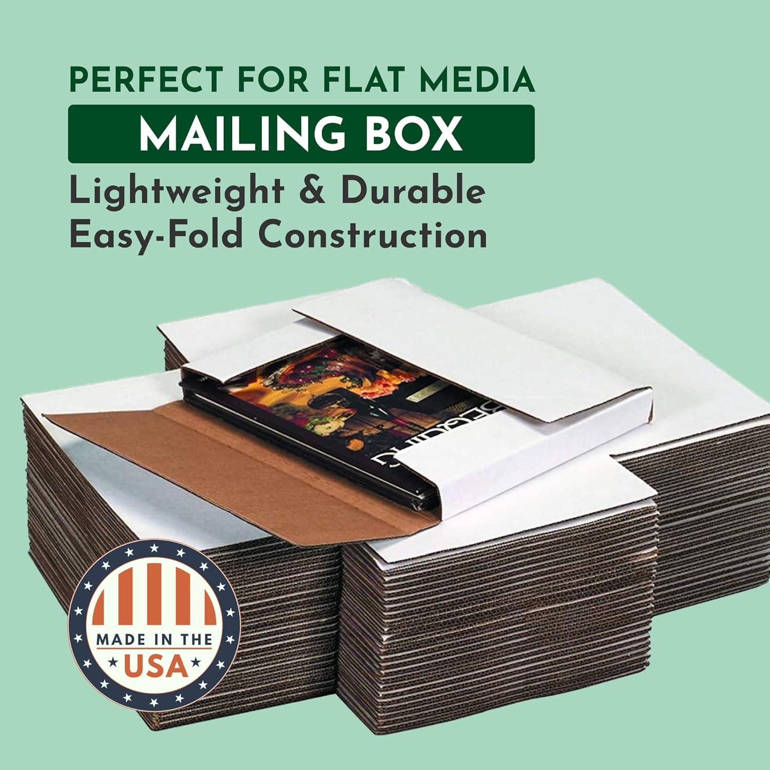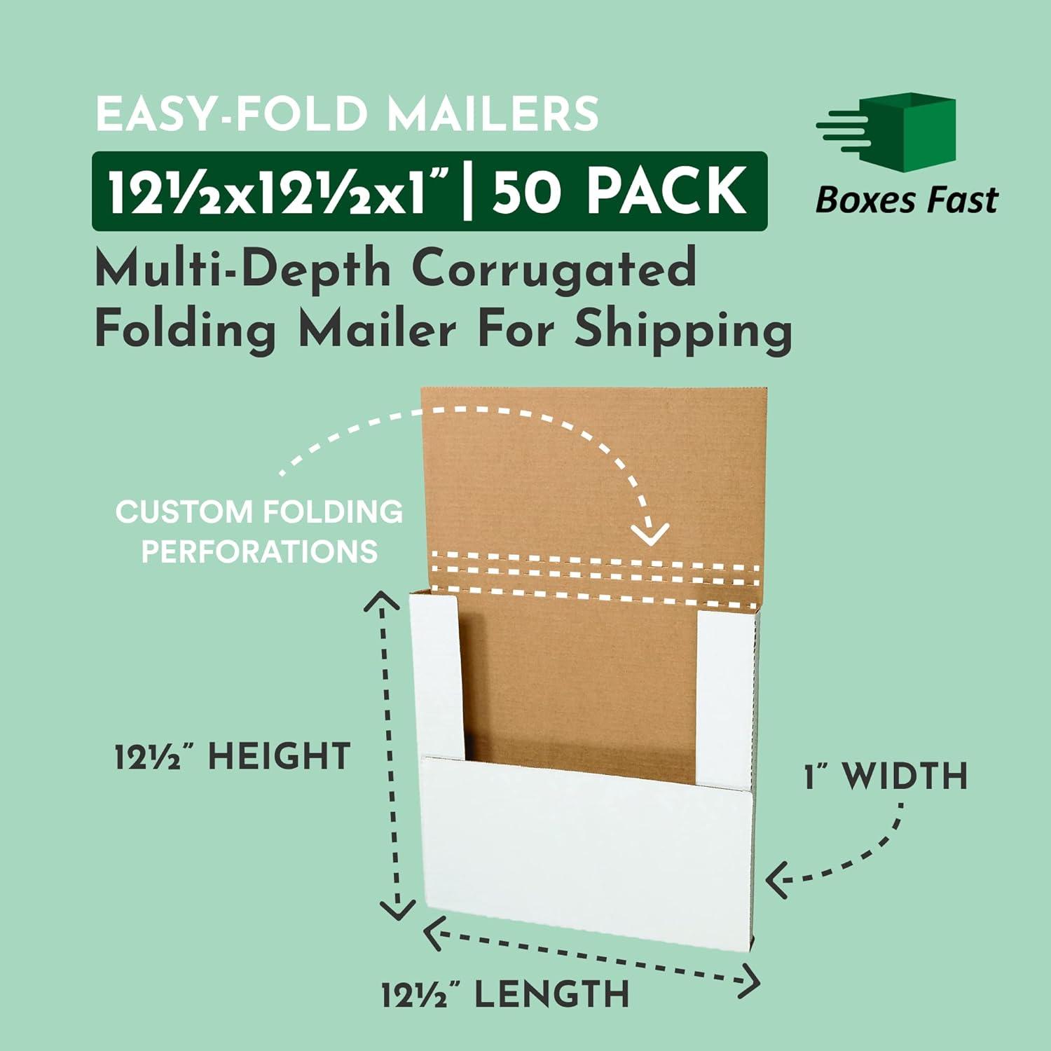 12 1/2 x 12 1/2 x 1" White Easy-Fold Mailers. Great for mailing books, catalogs and framed pictures. Scored at multiple depths for flexibility. Quickly package items. No carton set up. Simply place product in the center, fold in the sides at your desired depth and seal with tape. Attractive 200#/ECT-32-B white corrugated construction makes a quality impression. Proudly me in the USA!