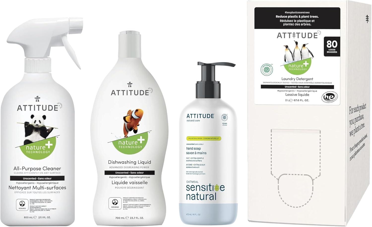 Unscented All-Purpose Cleaner: Formulated with plant-based and mineral ingredients, this all-purpose cleaner is a must-have for a sparkling clean home. This household essential can be used on most indoor and outdoor surfaces. ATTITUDE™ unscented all-purpose cleaner eliminates dirt and dust without leaving any streaks. Unscented Dishwashing Liquid: ATTITUDE™ unscented dishwashing liquid is your new home essential. Its strong degreasing power with foaming action eliminates grease and residue. This