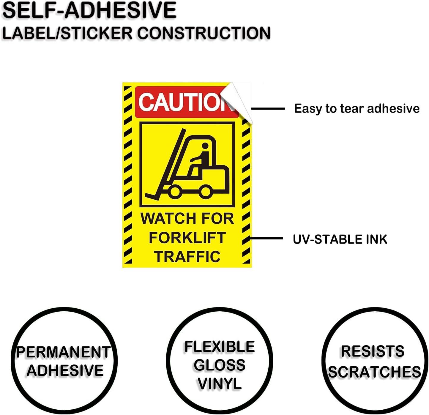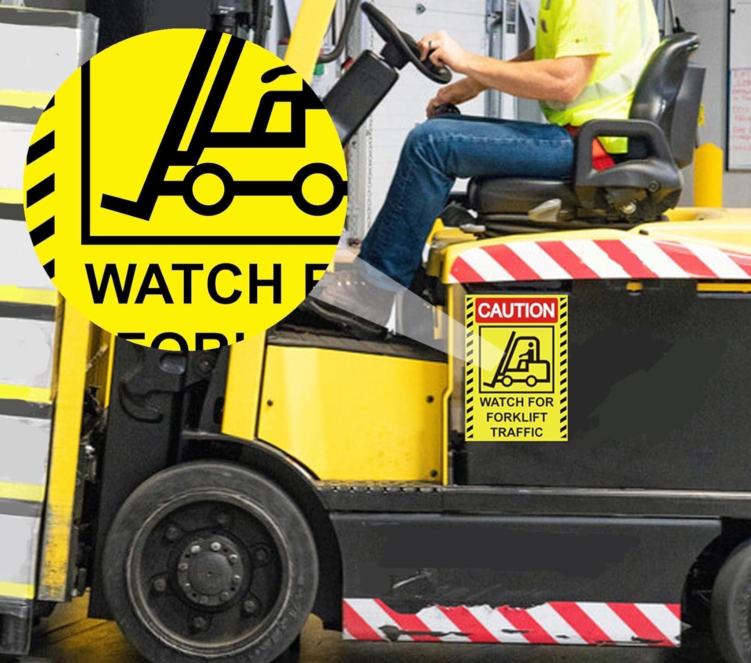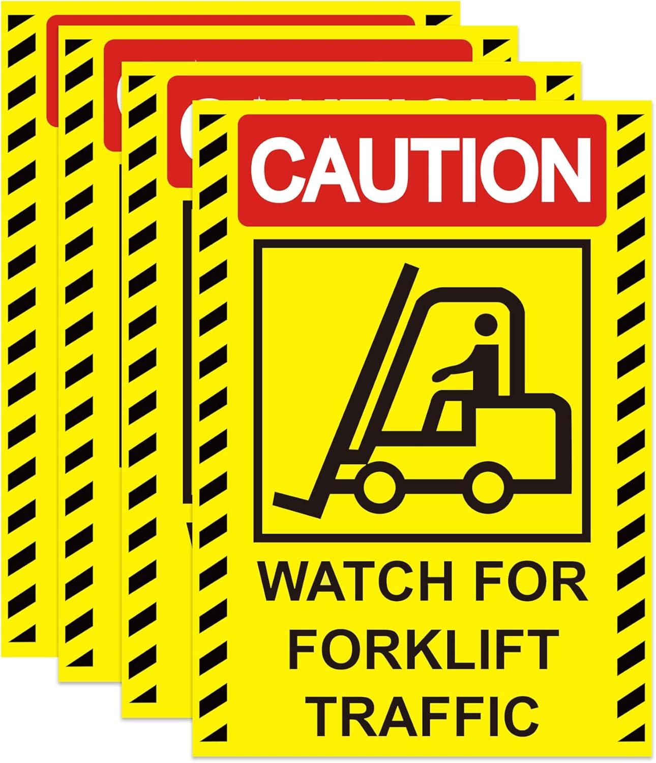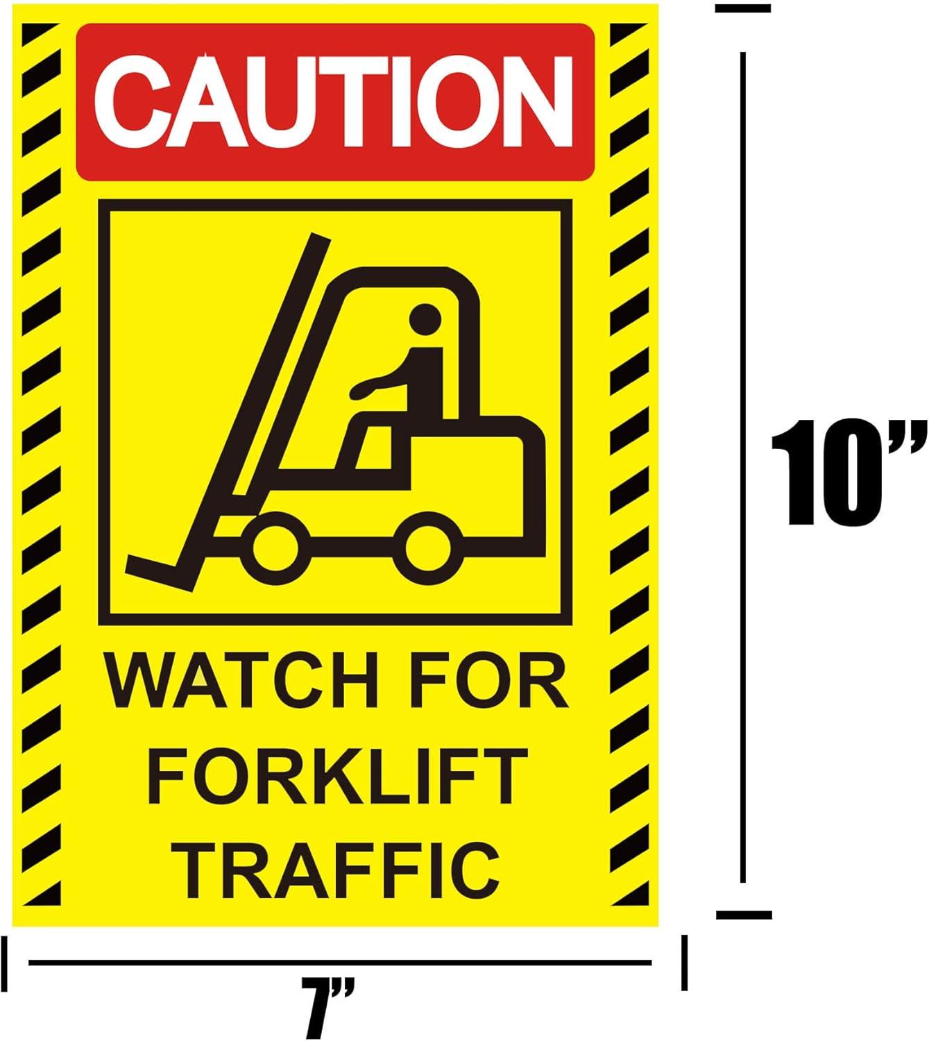 Caution Watch for Forklift Traffic Sign Stickers. Size:7 x 10 inch. Quantity:4 pack. Material:High quality vinyl material. Easy to peel off and stick on any area where forklifts are frequently occurrence. Used to warning pedestrians and staff to be careful of forklifts. Perfect warning labels: Alert everyone to exercise caution while taking some burden off your shoulders, regarding safety on your property.
