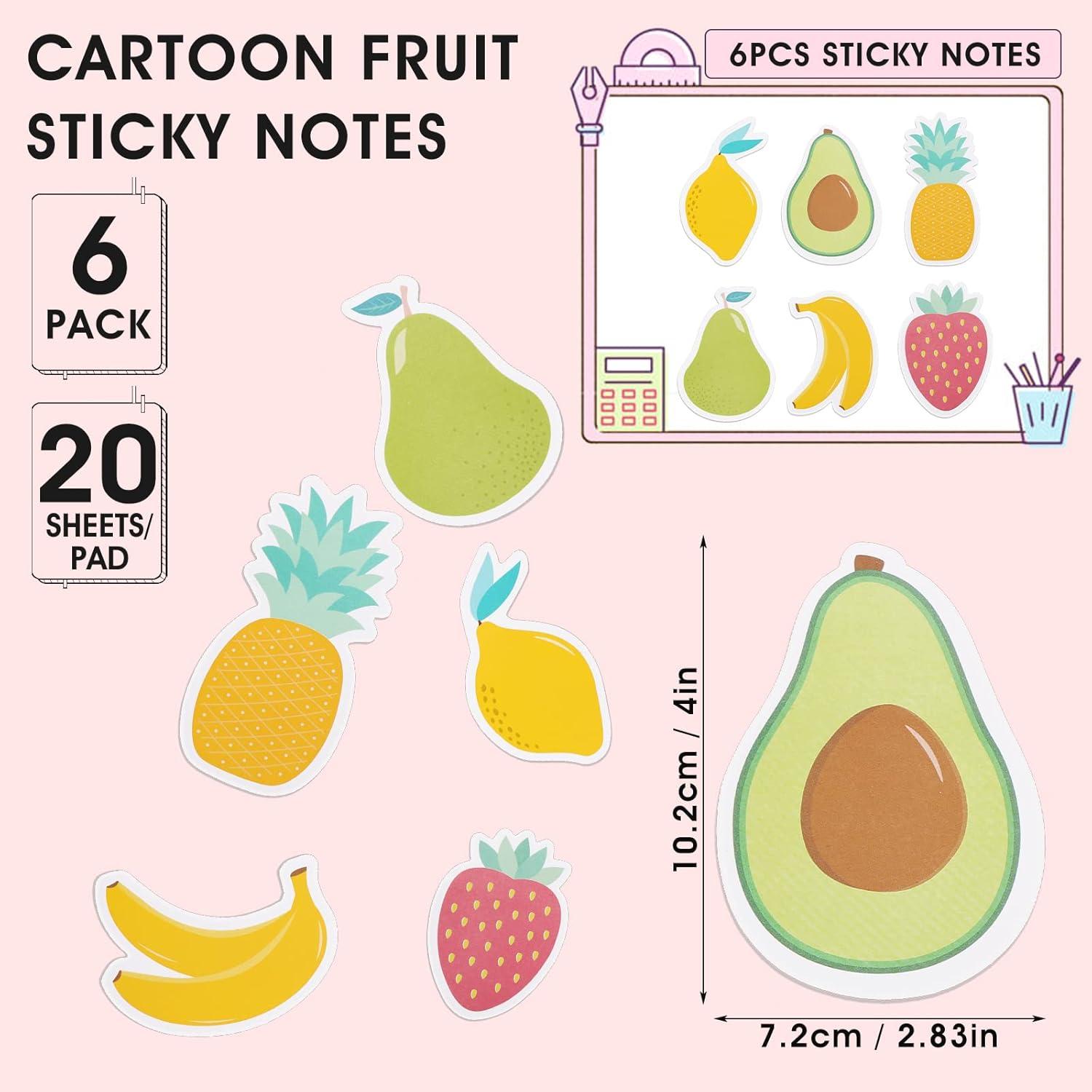 - 【6 Pack Fruit shape Notes】you will receive 6 pack large cartoon fruit self sticky notes,20 pieces for each pack,120 sheets in total; 6 different fruit pattern styles including lemon, avoco, banana, strawberry, pineapple, pear. You can put it in a backpack or a handbag, put a note between the pages of a book, or note down important messages.