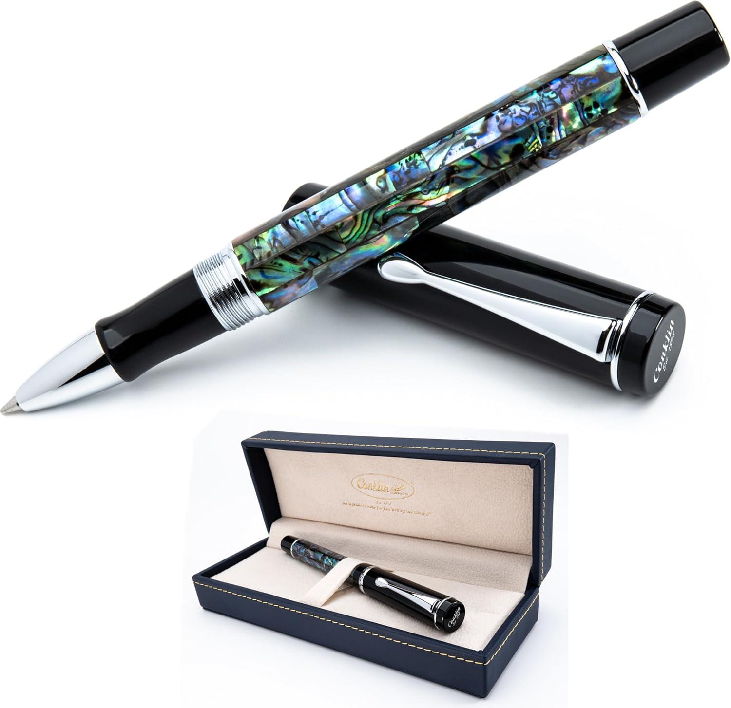 The Conklin Duragraph Ballpoint Pen in Abalone Nights is a masterpiece of pen design and a unique gift that embodies luxury and trition. Since 1898, Conklin has been at the forefront of luxury writing instruments, and the Duragraph™, introduced in 1923, is a testament to that legacy. Known as 'the definitive' pen, it was built to last and be passed down through generations. The Abalone Nights edition is meticulously handcrafted from premium European-gre resins, featuring a stunning abalone shell