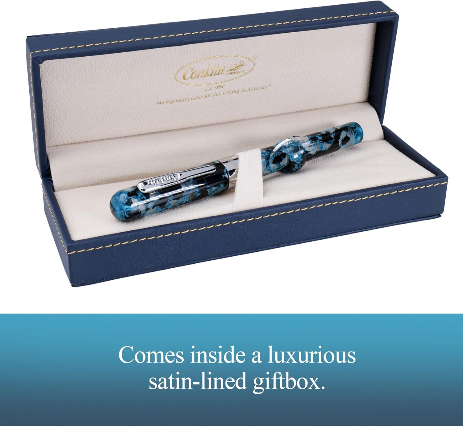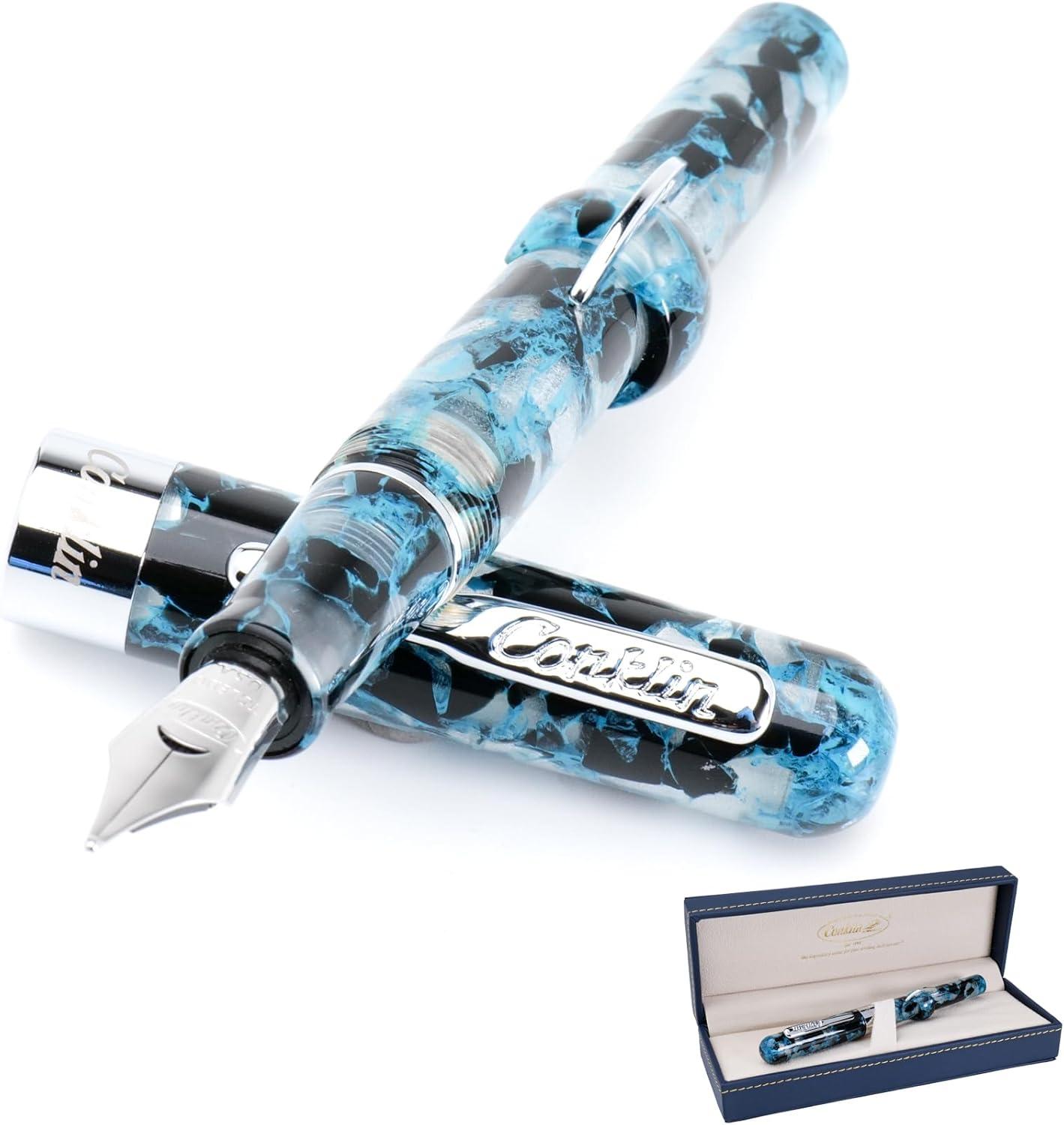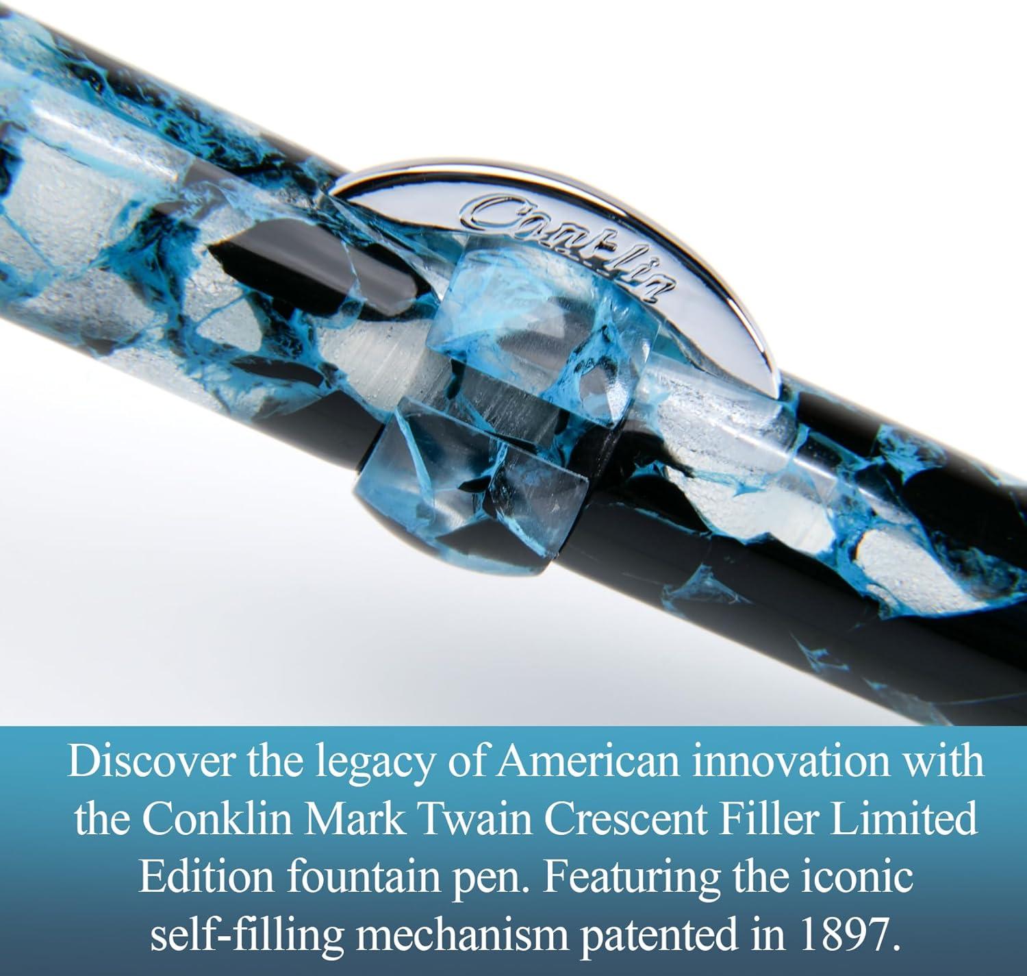 The Conklin Mark Twain Crescent Filler Fountain Pen in Blue Array with Chrome Trim and a Fine nib is a stunning blend of historical legacy and modern design. Since 1898, the Conklin Pen Company has been at the forefront of innovation in the pen industry, with the Crescent Filler being the first pen to offer mobility, thus freeing writers from the dependency on ink bottles and quills. Endorsed by Mark Twain, this pen continues to be an icon of fine writing instruments. The Blue Array finish, comp