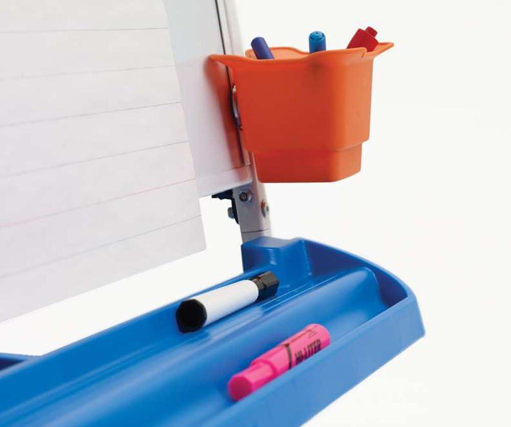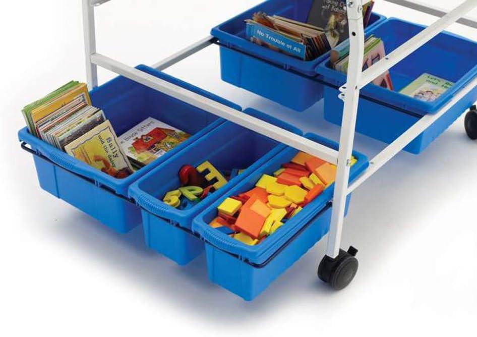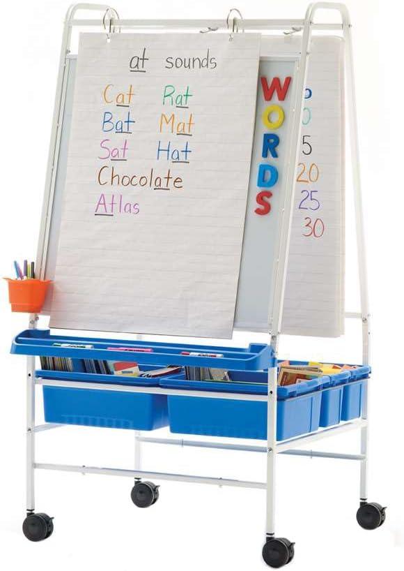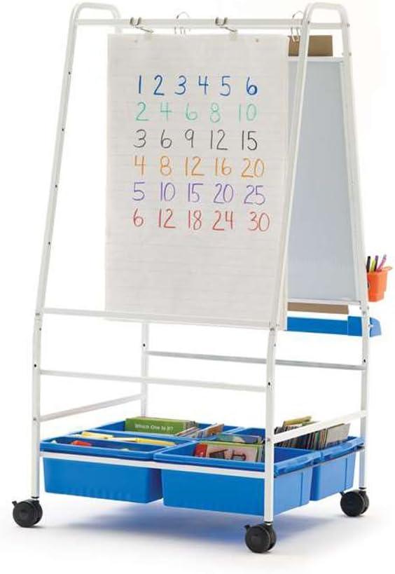 This new easel features the quality build of our teaching centers as well as an attractive price point for tight budgets. Small and Open Tubs can be positioned on the upper or lower level to accommodate various sized teaching manipulatives. Front magnetic dry erase surface. Ultra-Safe premium book ledge that locks into position. 3 Large and 2 Small Open Tubs with safety stops. 1 repositionable Tiny Tub on front (ideal for storing extra markers). 2 Snap-on chart paper hooks. 2 Hooks within the ea