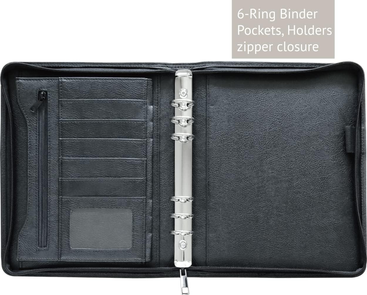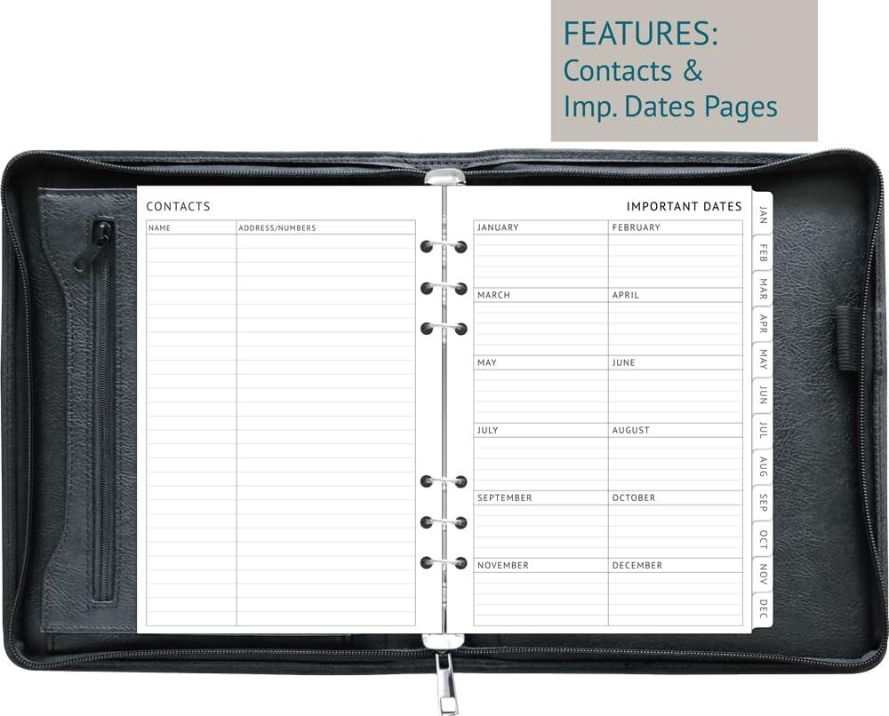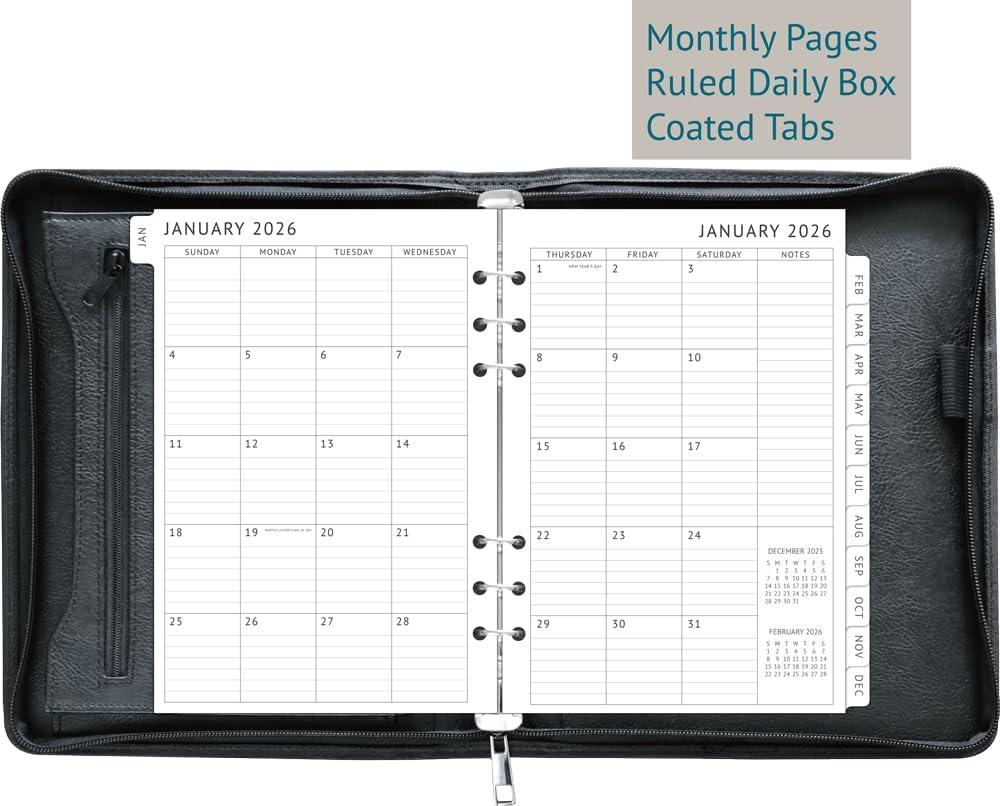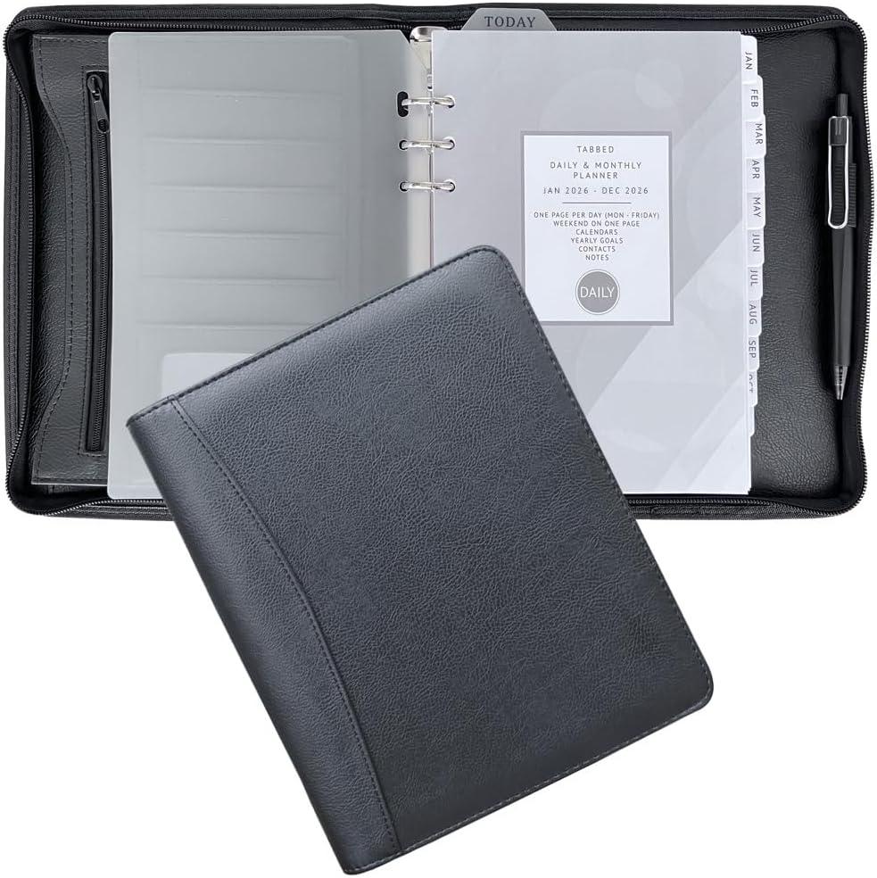 Track appointments, make to-do lists, set goals, and life a more organized lifestyle with a weekly and monthly planner that helps you manage it all. A5 Zipper Binder Details: vegan leather cover durable 6-ring binder, 1” rings large open & zippered pockets ID pocket 5 card sleeves elastic pen holder zipper closure fit standard 6-hole punched A5 pages 2026 Daily Planner Refills: runs from Jan 2026 to Dec 2026 monthly spre pages with coated tabs one page per day (weeked on one page) calendar and h