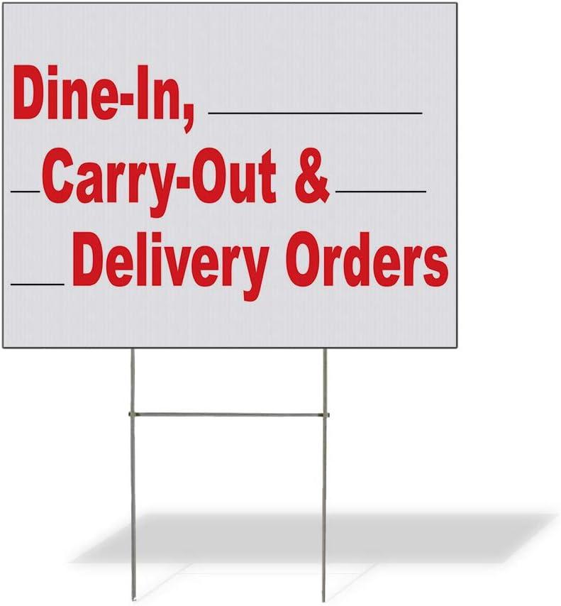 Weatherproof Outdoor for Sale Yard Sign Share your ideas, opinion, beliefs & vertisement in your neighborhood with our yard garage sale sign. Our street sign provides the most economical form of vertising and can be displayed along rosides, in front of stores or in gardens. It can also be easily mounted anywhere without the stand with zip ties, screws or nails (not included). The text res dine-in, carry-out & delivery orders . Perfect as: pizza yard sign, dine-in, carry-out & delivery orders sig