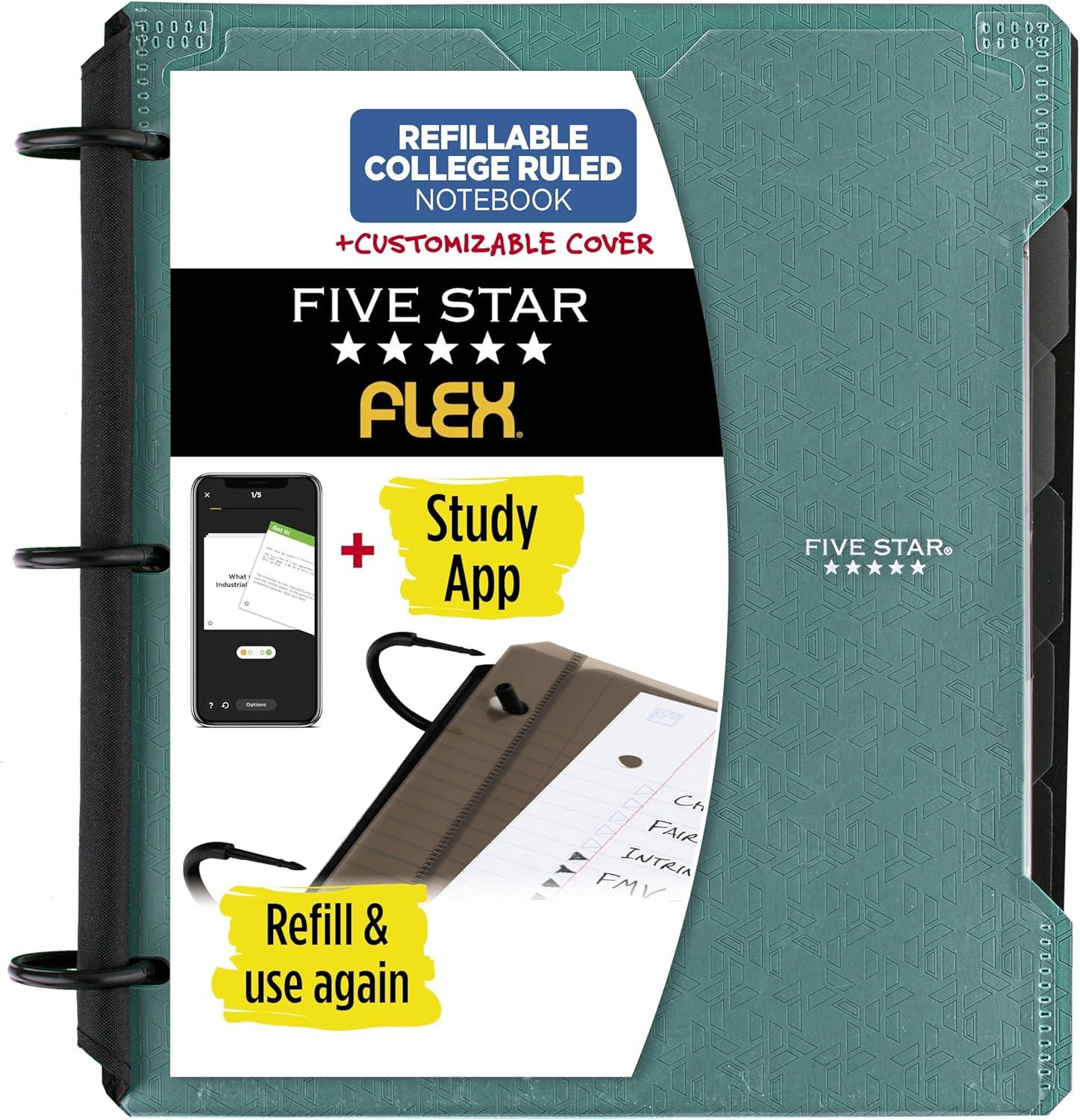 LASTS ALL YEAR. GUARANTEED! Five Star Flex Refillable Notebook gives you the freedom to organize your notebook to fit the way you study. Scan, study and organize your notes with the Five Star Study App. Create instant flashcards and sync your notes to Google Drive to access them anywhere from any device. Reuse again and again! This refillable notebook lets you d, remove and rearrange papers in an instant. Comes prefilled with 60 college ruled sheets. Patented TechLock rings won’t break or misali