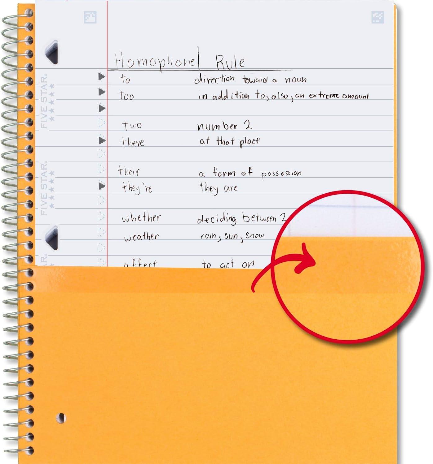 LASTS ALL YEAR. GUARANTEED! Scan, study and organize your notes with the Five Star Study App. Create instant flashcards and sync your notes to Google Drive to access them anywhere from any device. This Five Star 1 subject notebook has 100 double-sided, wide ruled sheets for organized notetaking. The sheets fight ink bleed and are perforated for quick and easy tear out. The sheets measure 8" x 10-1/2" when torn out. Tough pockets help prevent tears and hold 8" x 10-1/2" loose sheets, handouts and