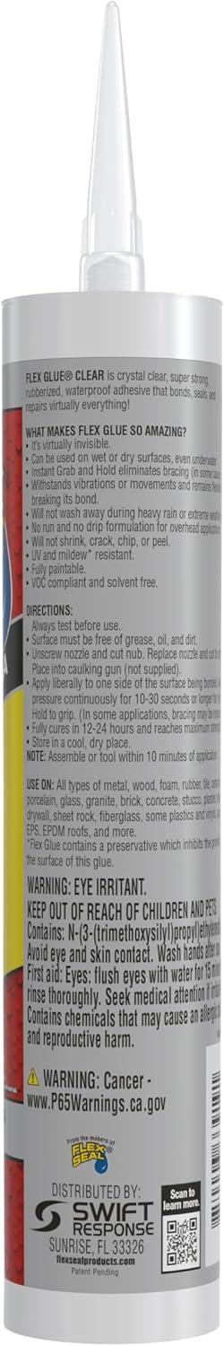 Flex Seal Flex Glue is an easy-to-use, super-strong, rubberized waterproof glue that instantly bonds, seals and repairs virtually everything. No need for screws or nails, it's perfect for all types of repairs. Can be used on dry or wet surfaces and even underwater. Strong instant-grab hesive works like a magnet, locks into place and holds on tight.