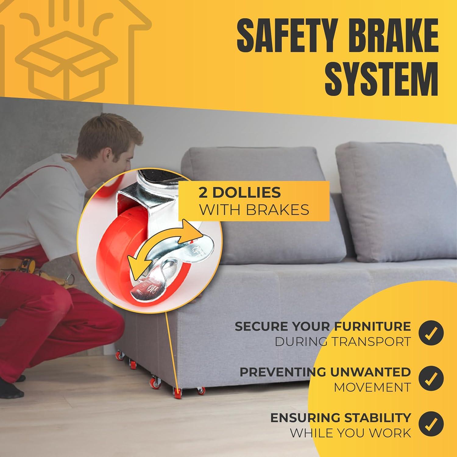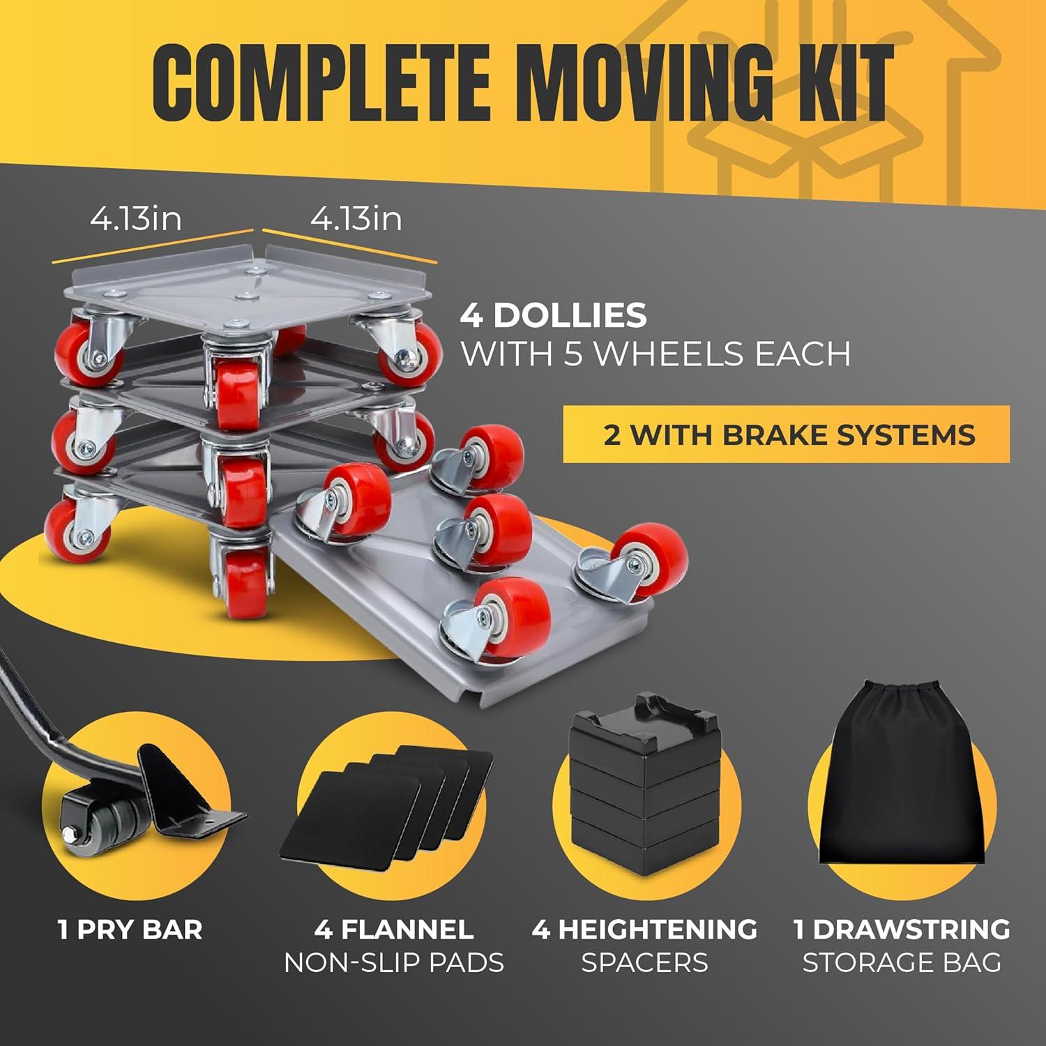 🧰 ALL-IN-ONE MOVING KIT: Includes a high-leverage lifter, 4 roller dollies (2 with brakes), anti-slip ps, gloves, and a storage bag. Everything you need to move with confidence.