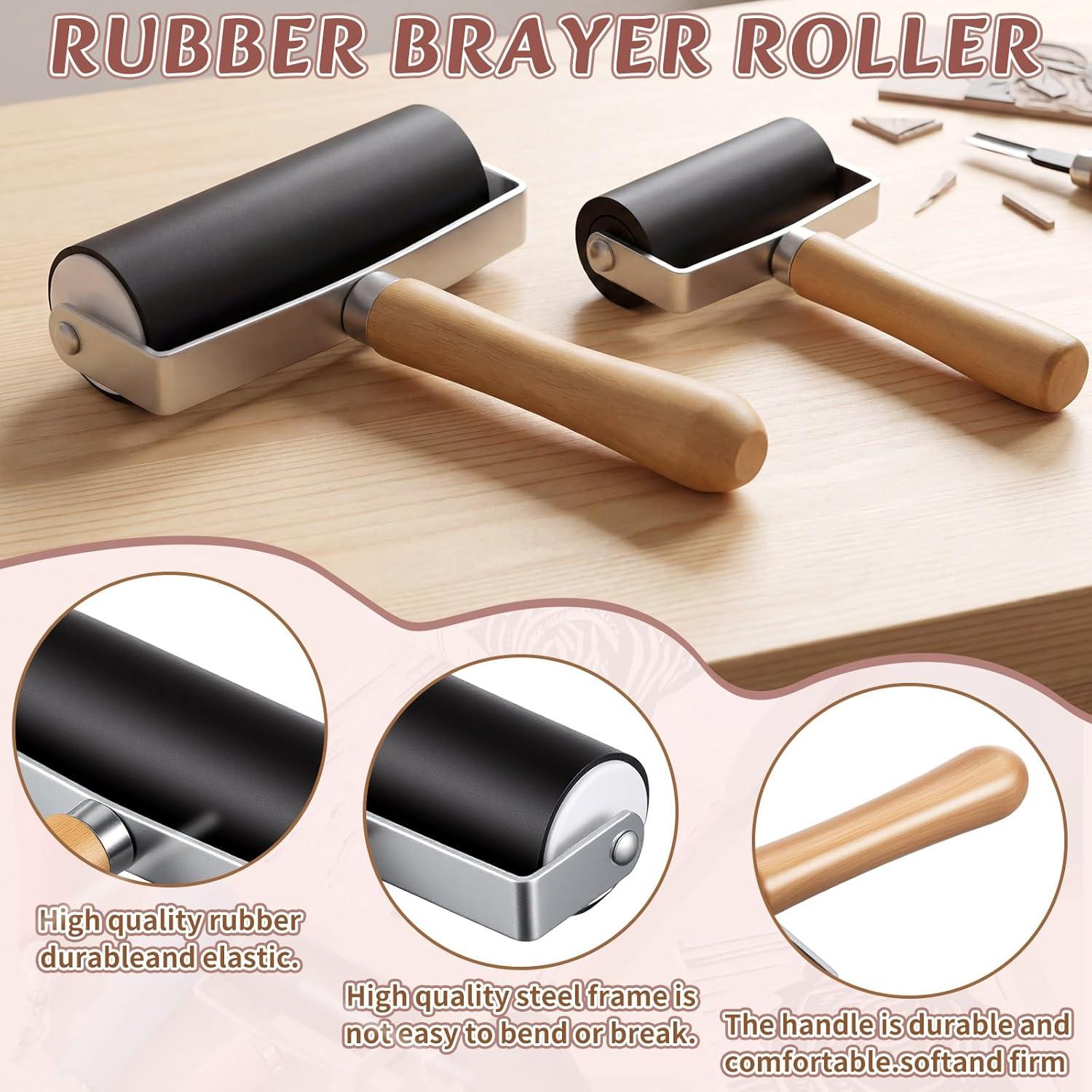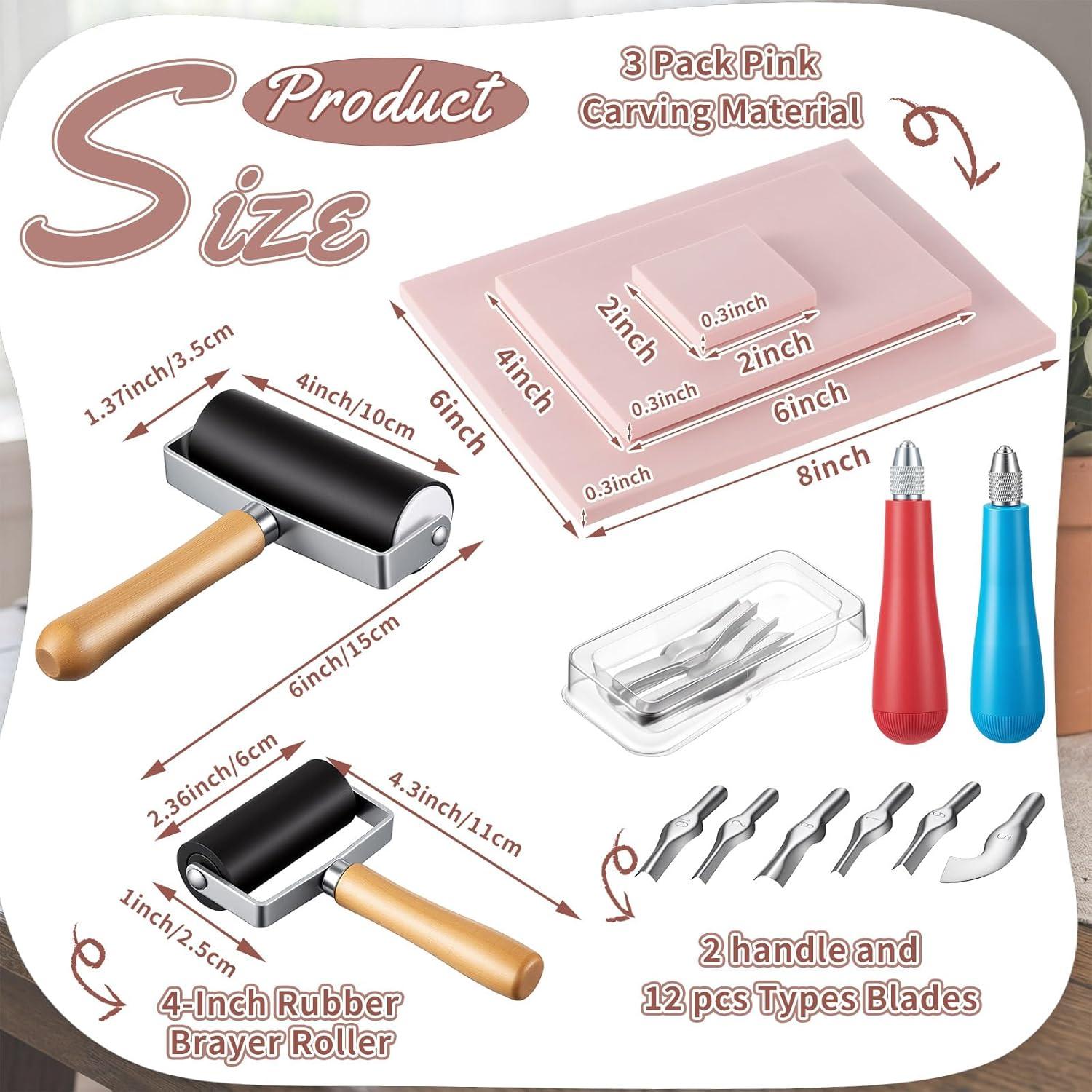 - Functional Rollers and Coordinated Tools: the stamp carving kit is equipped with 2 comfortable woodcut tools of different sizes and smooth rollers; The roller sizes are about 4.53 x 2.36 x 0.98 inches and 5.91 x 3.94 x 1.38 inches respectively; The different sizes meet your various engraving needs and are very suitable for applying ink, making your woodcut prints come alive