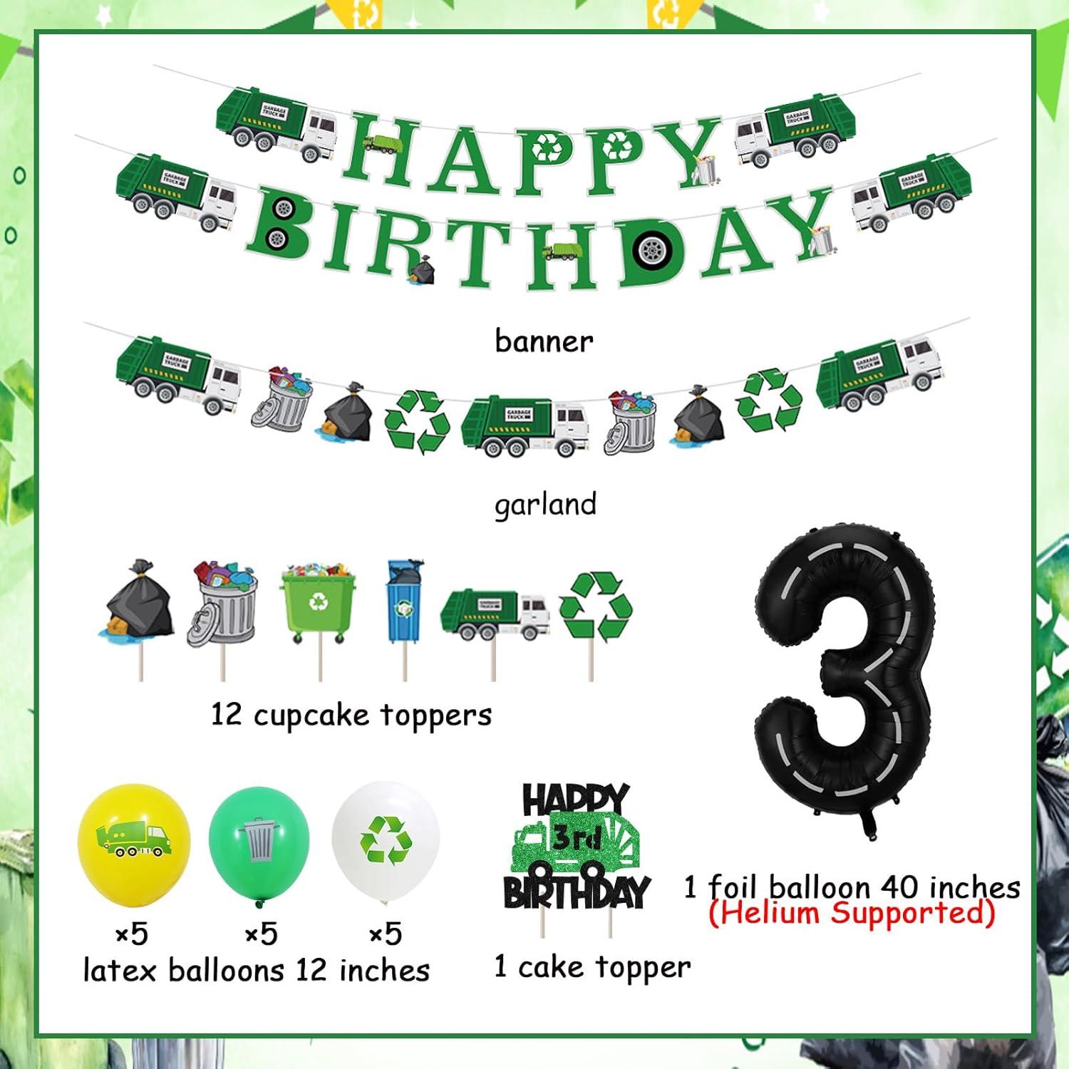 - You will receive: 1pc garbage truck 3rd birthday cake topper, 12pcs cupcake toppers, 15pcs latex balloons 12inches, 1pc banner, 1pc number 3 foil balloons 40inches, 1pc garbage truck garland, and 2m white ribbons