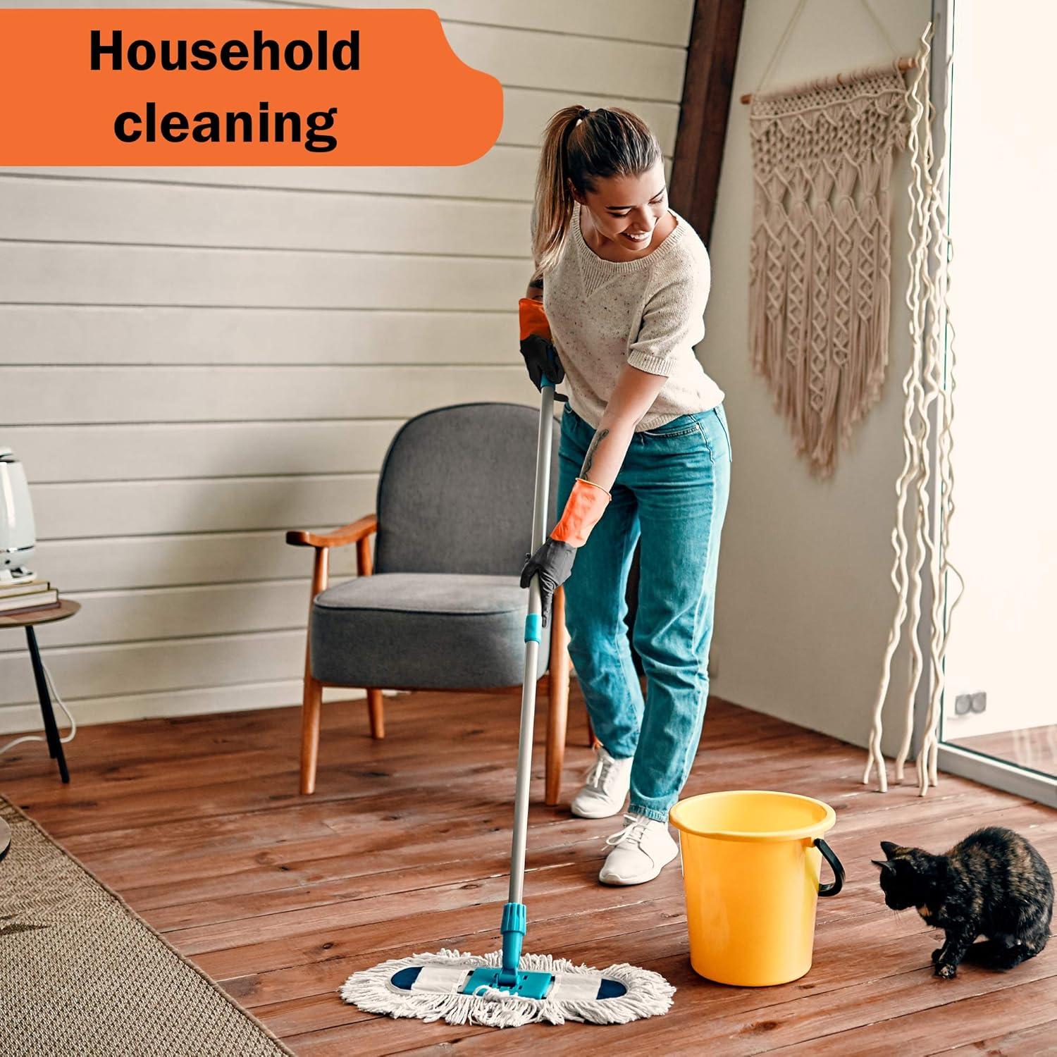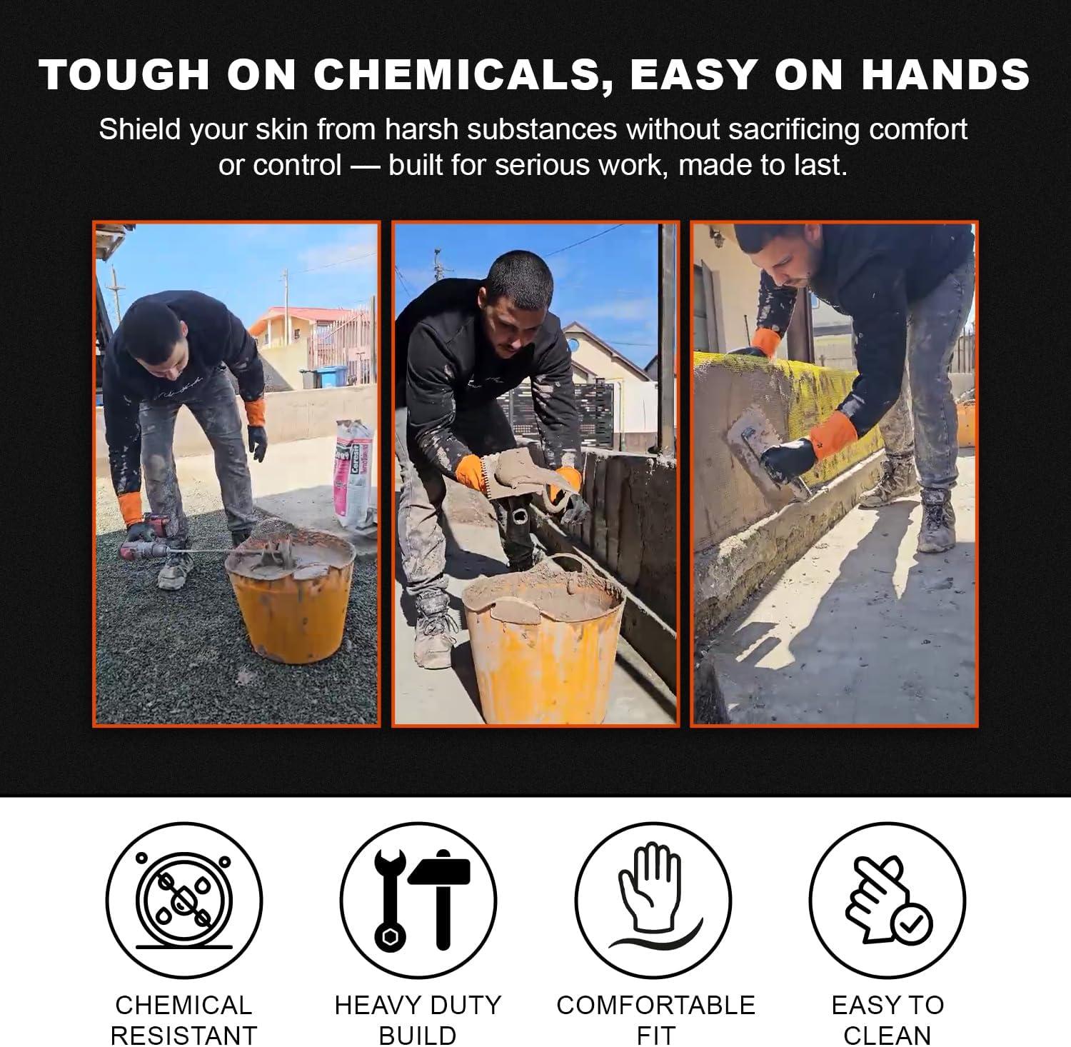 Let Gastody's Chemical Gloves offer you premium protection of your hands against a bro range of chemicals. Our set includes 2 pairs of heavy-duty chemical gloves, color black and bright orange, me of latex for great durability and flexibility. These protective gloves have a tailored fit, designed with heavy textured fingers and palms to help with your grip on even the most fragile items or while working with slippery objects. Inside, they're soft and not rubbery at all. Medium-thick, they offer