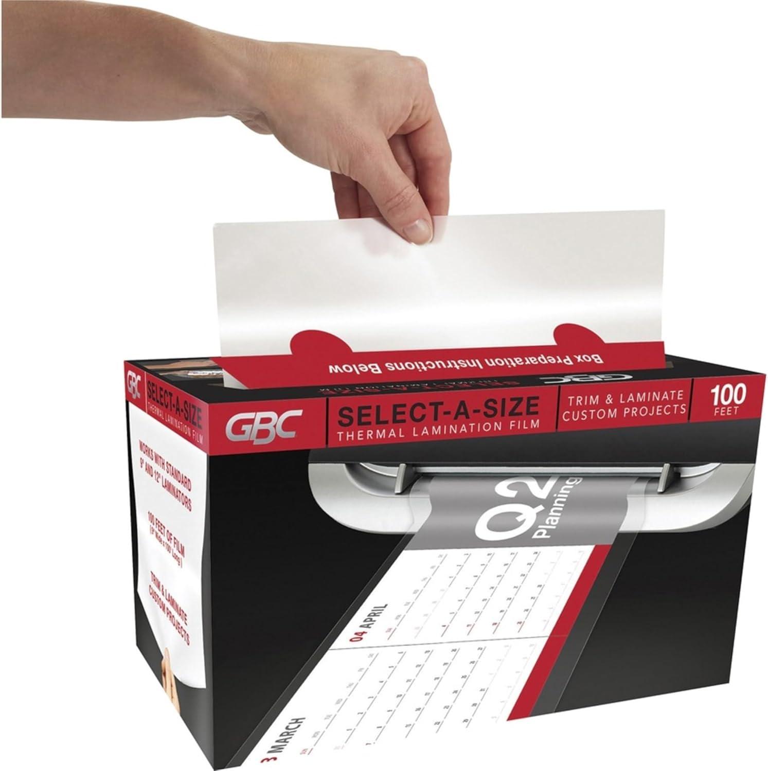 Select-A-Size Thermal Lamination lets you create a variety of laminated items including banners, signs, ID bges, education items, training materials and more. The possibilities are limitless! Simply use the included trimmer to cut the amount of film you need to create a pouch that fits the task at hand. The rey-to-use box comes with a perforated top for easy cutting and film storage. Choose the amount of pouch required through the top of the box and cut it with the included trimmer. Lamination r