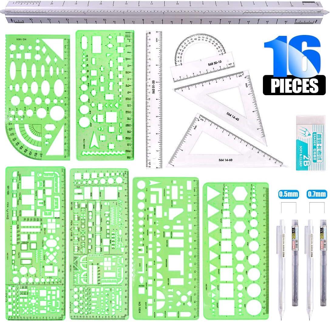 Glarks 16 Pieces Measuring Templates Building Formwork Stencils Geometric Drawing Rulers and Triangular Architect Scale Ruler with Pencil, Pencil Le Refills, Eraser for Office and School Specifications: Double scale building ruler: 24.3 x 9.5 cm Building template: 20 x 10 cm Furniture building template: 19 x 9 cm Geometric drawing template: 22 x 10 cm Multifunctional drawing template: approx. 19.4 x 10 cm Material: Plastic, Aluminum Color: Clear Green, Clear Quantity: 16 pieces Package Detail: M