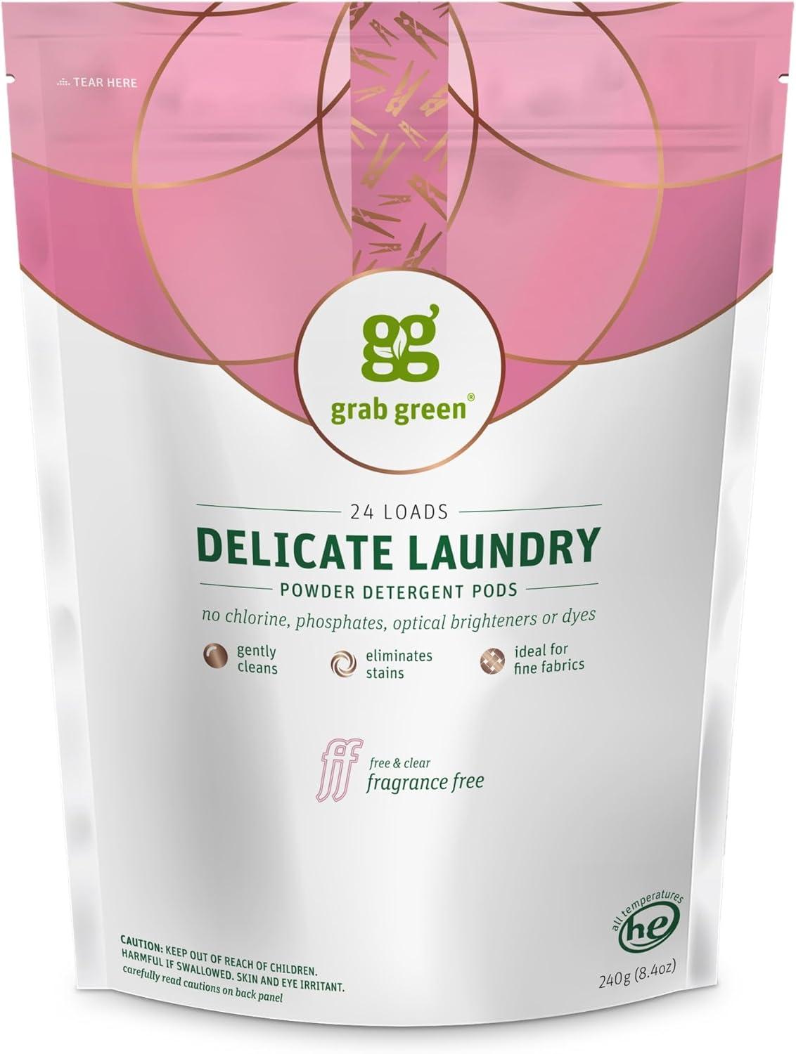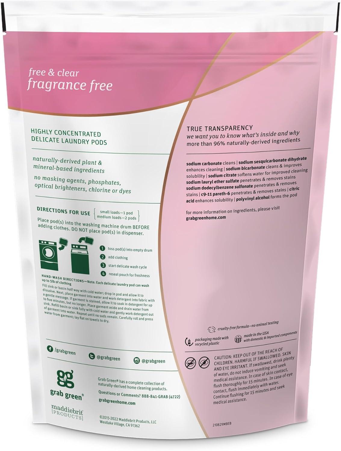 Grab Green Delicate Laundry Detergent Pods are ideal for fine fabrics and linens. The gentle formula cleans deeply without fing, shrinking or causing clothes to lose their shape, all with one pre-measured, concentrated powder pod. Thoughtful packaging includes a convenient, easy to use Velcro closure, clear use instructions, and we believe in full ingredient disclosure—what we call True Transparency—which is why we list every ingredient and the purpose for each ingredient on every package. Formu