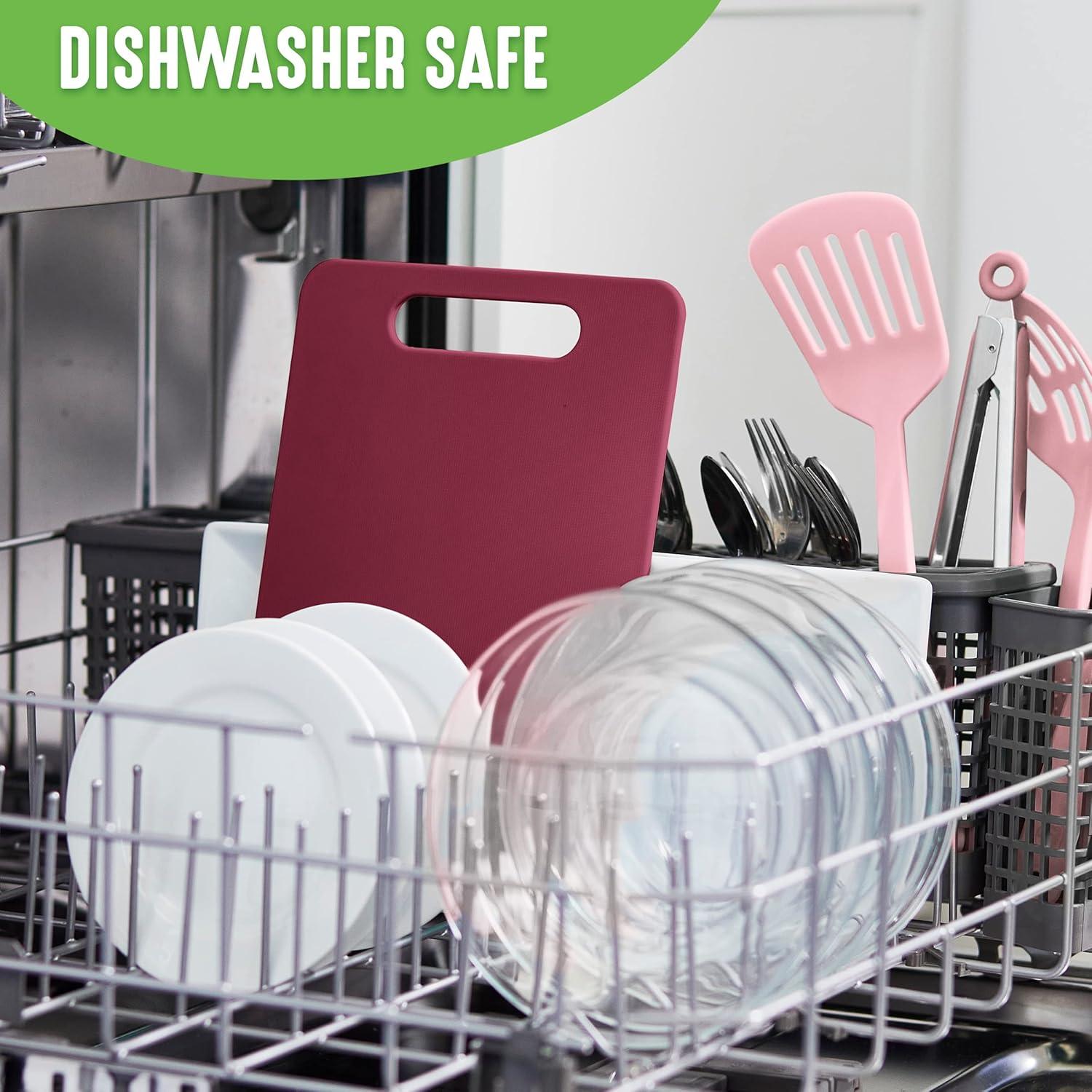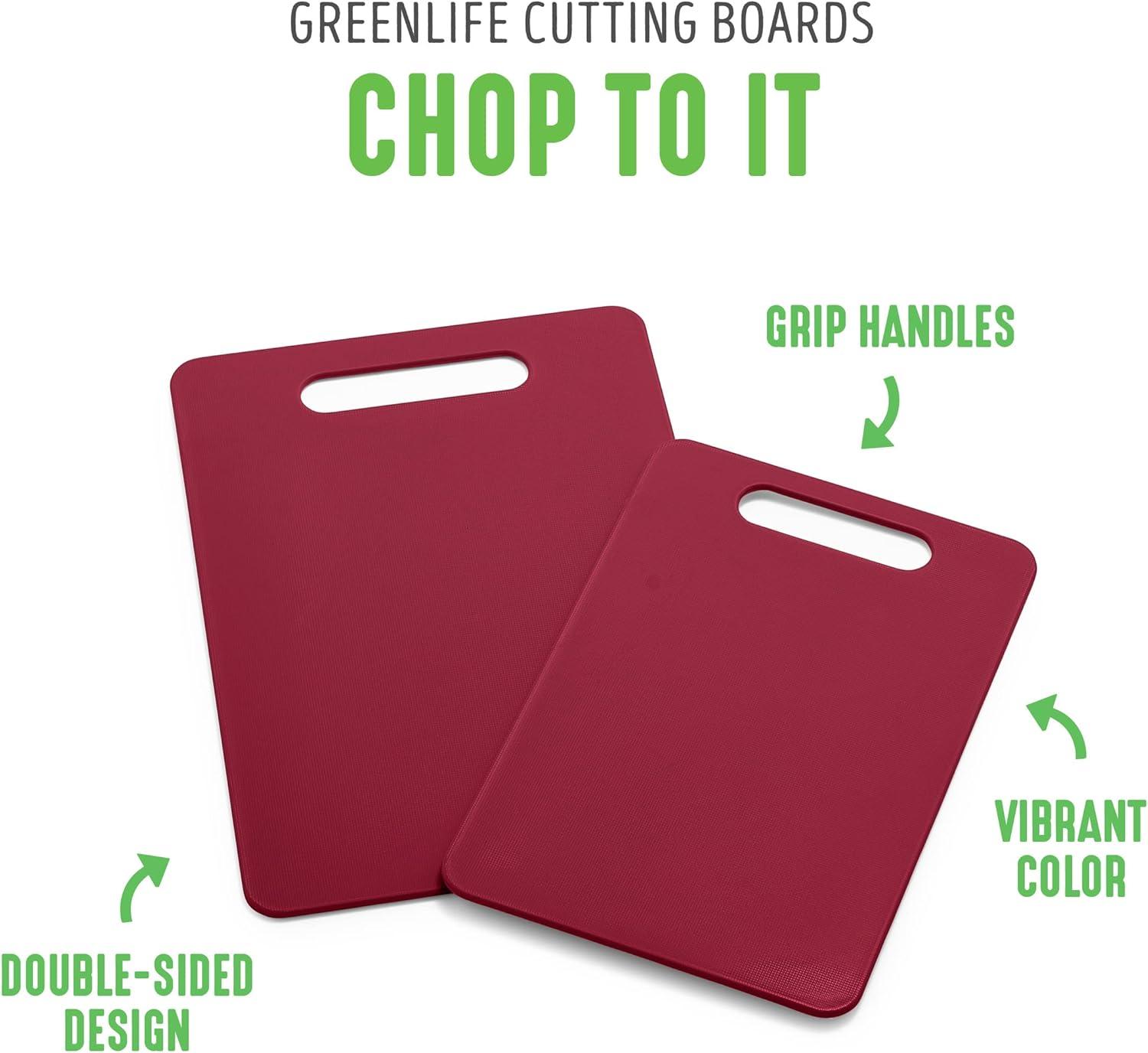 Vibrant color and a durable construction makes this cutting board from Green Life an eye-catching dition to any kitchen. Super durable, This set is chip and crack resistant as well as dishwasher safe to take the worry out of cleanup. Cutting board set includes: medium cutting board (8” x 12") and large cutting board (10” x 14”).