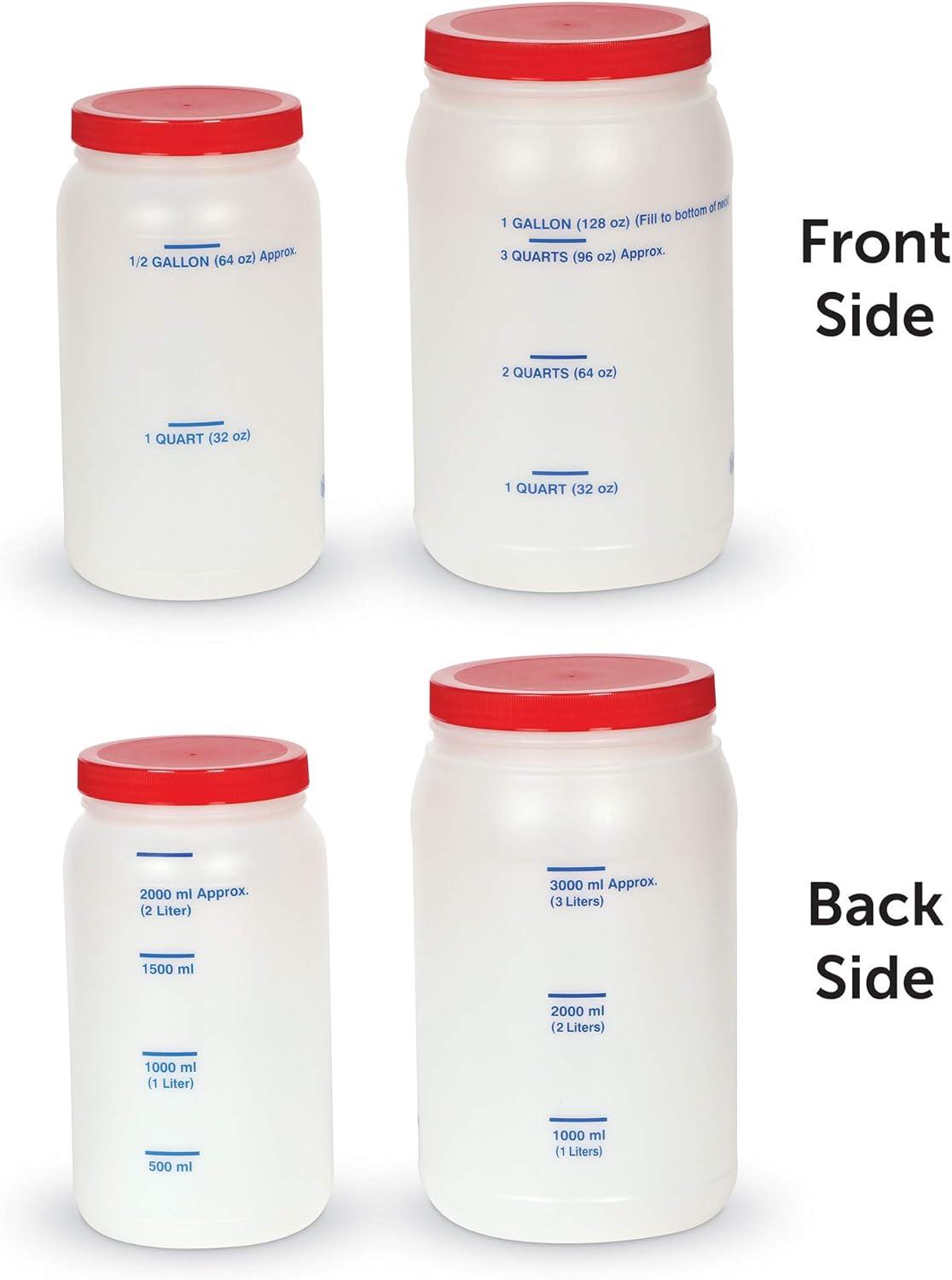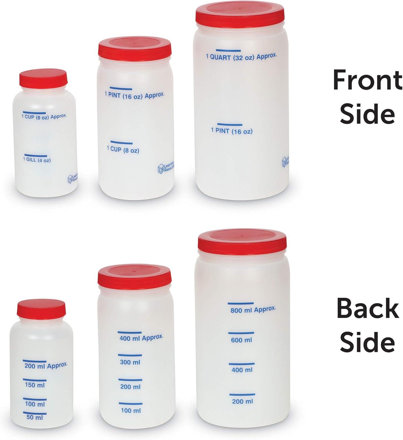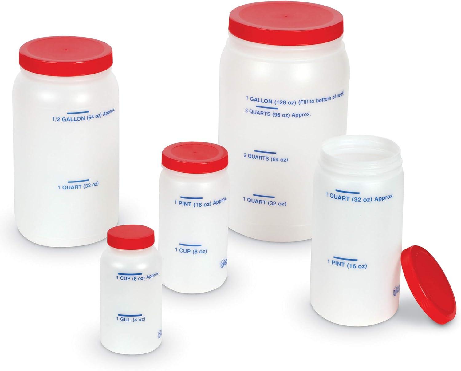 Enhance math and science lessons with these hands-on learning tools. Set of 5 sturdy plastic jars are perfect for both customary and metric measurements and include screw-on covers. Customary capacities are half-gallon, quart, pint, and cup. Metric measurements range from 50 ml to 3000 ml.