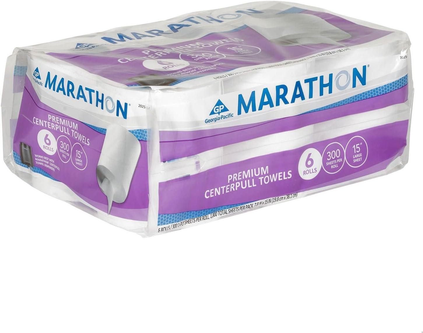 Marathon centerpull towels are soft and absorbent and designed to work with the Marathon centerpull towel dispenser. Each roll contains 300 7.8" x 15" towels that are delivered one-at-a-time through the Marathon dispenser. Each poly pack of 6 rolls contains the equivalent of 51 rolls of kitchen roll towels. These towels are a hygienic and cost-effective replacement for standard kitchen roll towels. They reduce the unlimited towel delivery and waste when used with Marathon CenterPull Towel Dispen
