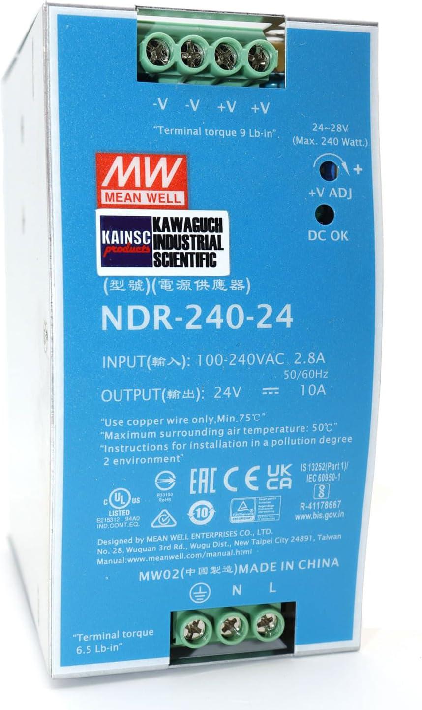 NDR-240 is one economical slim 240W Din Rail Power Supply Series, apt to be installed on TS-35/7.5 or TS-35/15 mounting rails EU RoHS: Compliant ECCN (US): EAR99 Type: Regulated Style: DIN Rail Input/Output Type: AC/DC Number of Outputs: 1 Output Type: Fixed Output Voltage (V): 24 Output Current (A): 10 Output Power (W): 240 Minimum AC Input Voltage (V): 90 Maximum AC Input Voltage (V): 264 Minimum DC Input Voltage (V): 127 Maximum DC Input Voltage (V): 370 Minimum Isolation Voltage: 3000VAC Lin