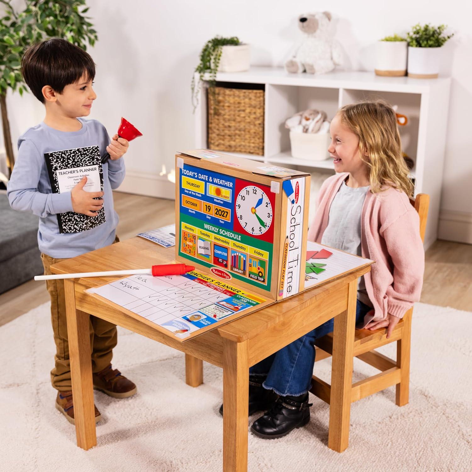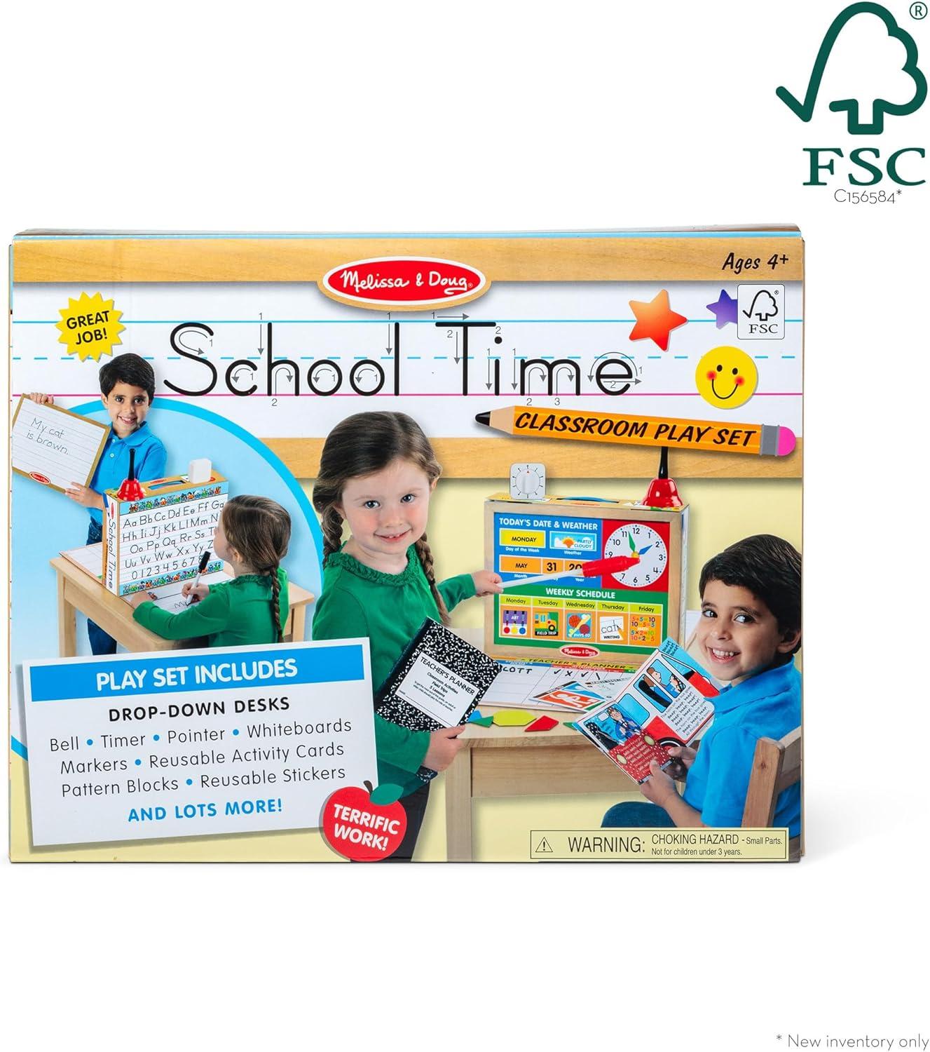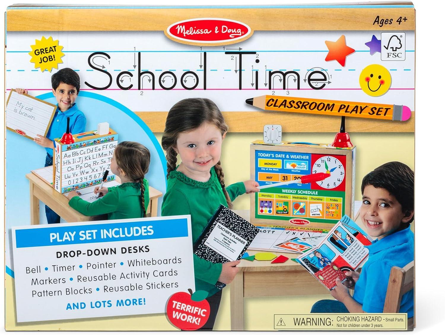 Product Description Open the box and the school day begins! With a drop-down teacher desk on one side and a student desk on the other, this innovative set allows kids to realistically play both roles! The exciting array of supplies--including 2 double-sided write-on, wipe-off boards, 2 dry-erase markers, 9 reusable activity cards, 12 pattern blocks, 150 reusable stickers, a bell, timer, pointer, and lots more--enables kids to explore a favorite activity and continue learning even out of the clas