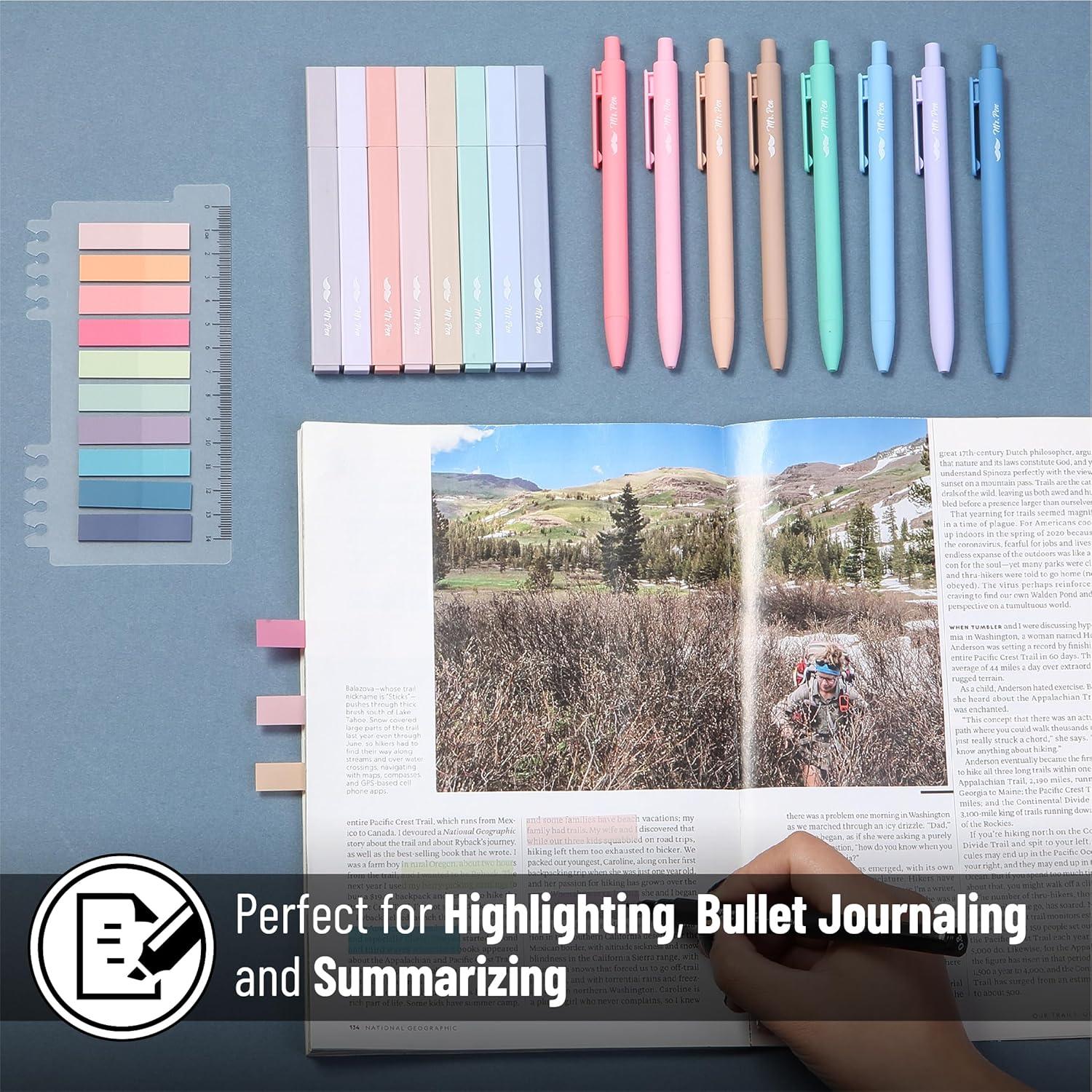 Mr. Pen aesthetic Bible highlighters and pens set includes 8 pastel highlighters, 8 matching gel pens, and 200 transparent sticky tabs for all your note-taking needs. Crafted with premium no-bleed ink, the highlighters and pens provide smooth writing and highlighting on delicate Bible pages without smudging. The sticky tabs measure a convenient size, allowing easy marking and organization while being transparent enough to view the text beneath. The highlighters feature a chisel tip for versatile