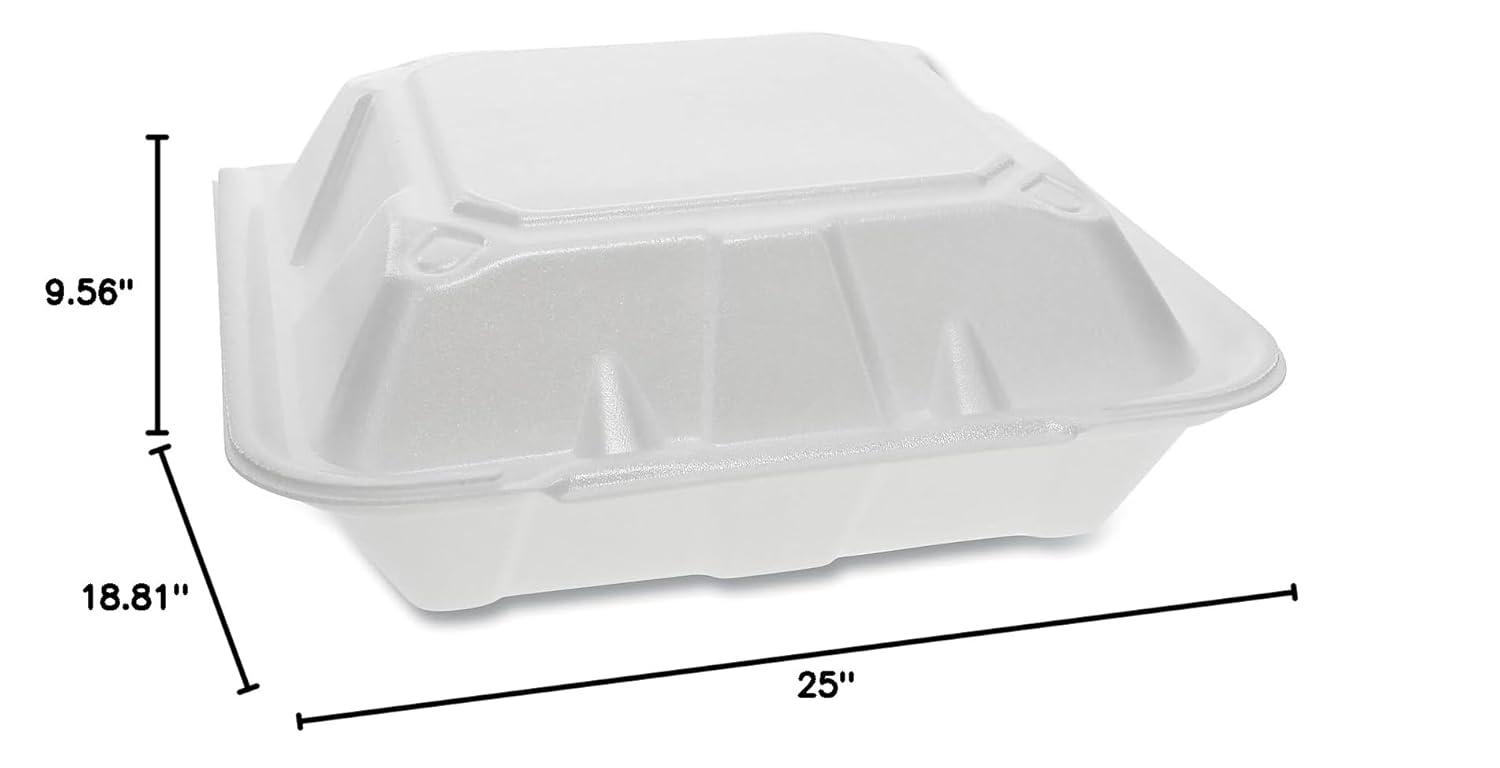 Durable foam construction makes hinged lid containers a perfect lunchtime choice. Containers are insulated to maintain food temperatures at their tastiest. Excellent for use with both hot and cold foods. Dual tab closure keeps food secure. Hinged lid foam containers provide a safe and durable option for taking food on the go. Food Container Type: Takeout Clamshell, Foam; Material: Foam; Color: White; Depth: 9".