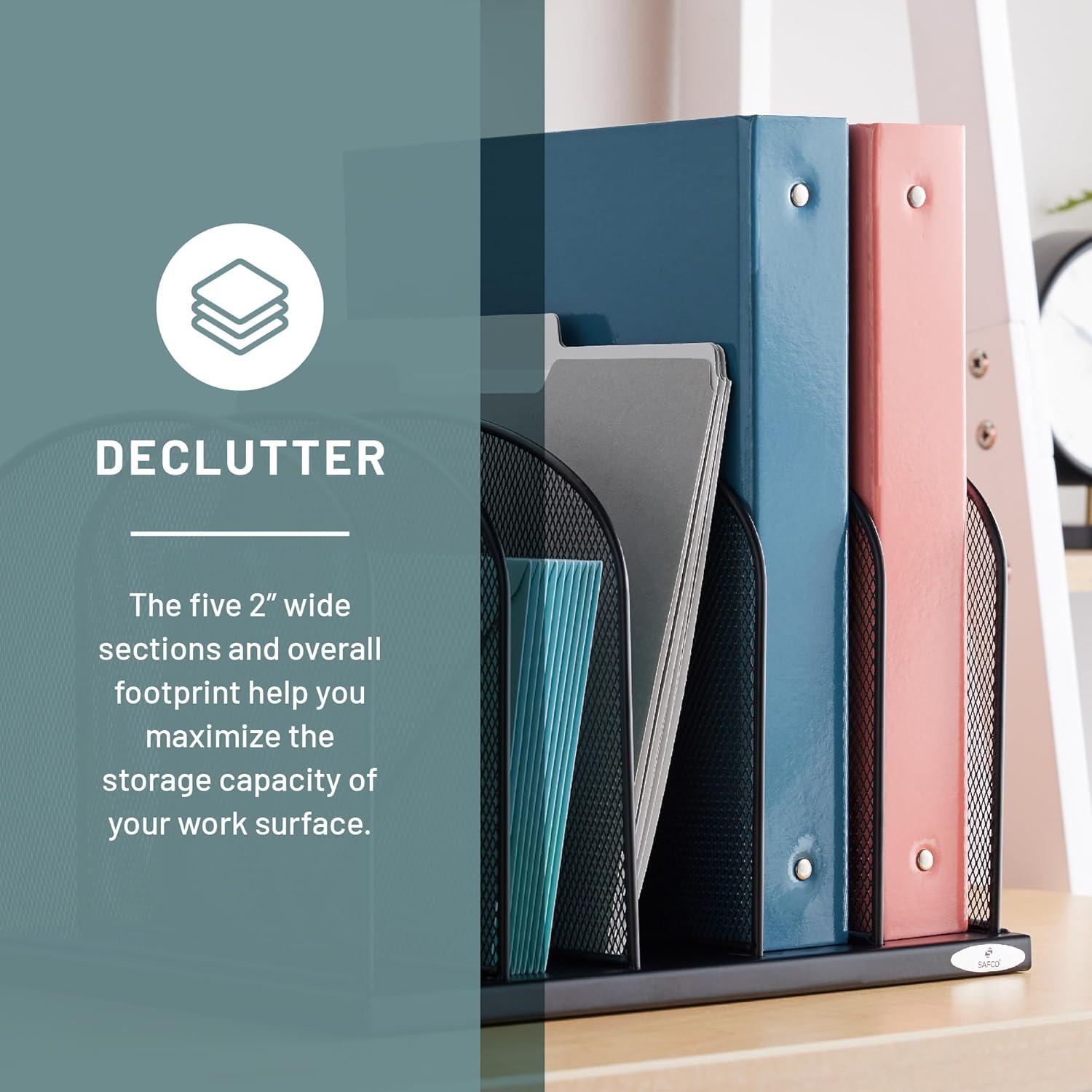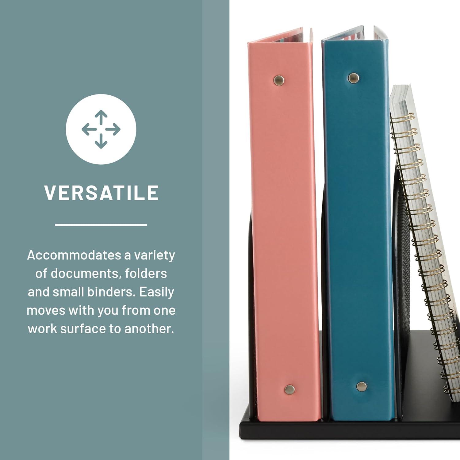 Onyx 5 Upright Sections is a wire mesh desktop organizer that aids in office supply organization and file storage. The steel mesh design is durable with a black powder coat finish. The organizer features five 2" wide vertical file sections.