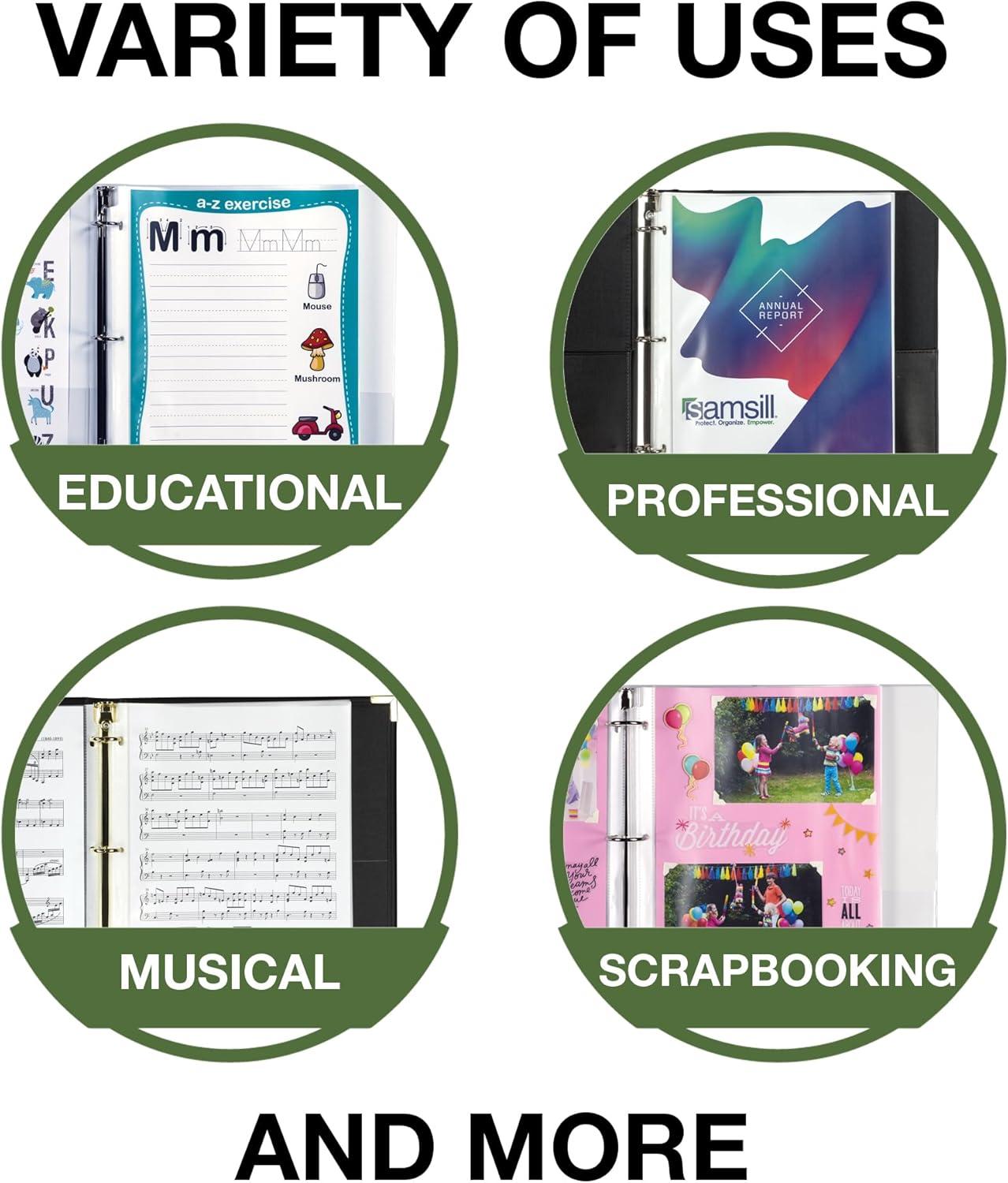 Samsill is a family-owned manufacturer located in the USA. We pride ourselves on creating the products for office and school supplies. Our 50 pack of light use protectors accommodate letter-size 8.5x11” sheets for versatile document storage.Slip your important documents into our sheet protectors. The finish allows you to see your documents with no glare while protecting them from tears, greasy fingerprints, and other wear and tear. These binder sleeves fit perfectly in a 3 ring binder allowing y