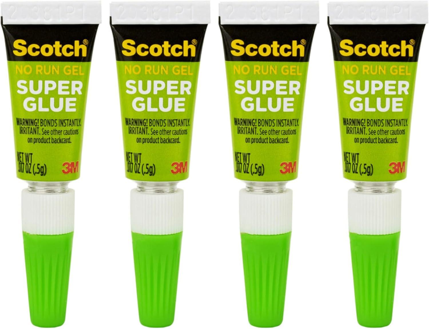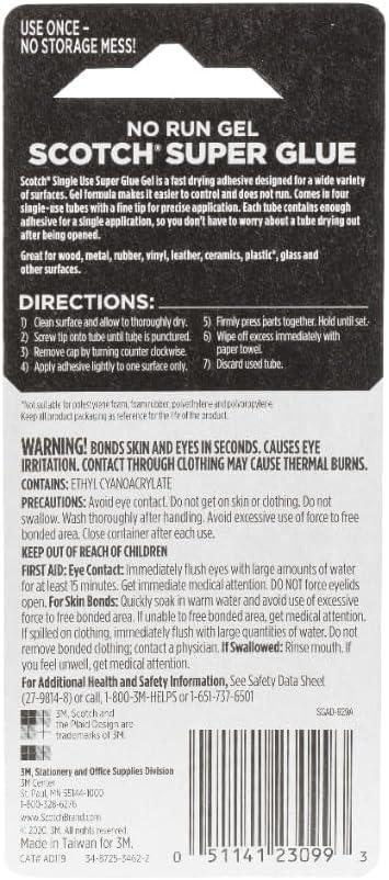 Scotch No Run Gel Super Glue is a fast drying hesive, permanent bonding. The gel super glue formula provides control, ensuring it does not run, making it perfect for a wide variety of surfaces. With its precision tip, this instant glue offers precise dispensing. Suitable for wood, metal, rubber, vinyl, leather, ceramics, some plastics, and other surfaces. Gel formula makes it easy to control and does not run. Each tube contains enough hesive for a single application. Not suitable for polystyrene