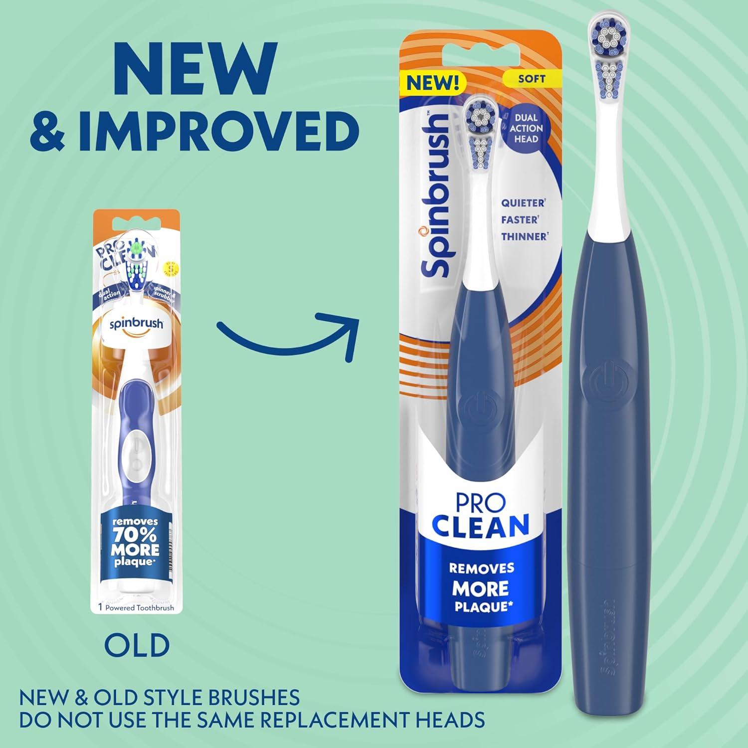 Kiss plaque goodbye when you brush with the New & Improved Spinbrush PRO CLEAN Powered Toothbrush! The brush he spins 50% faster than the previous model of ult Spinbrush and removes 70% more plaque vs. a manual toothbrush in hard-to-reach places. Other sleek design updates include a quieter experience and thinner handle than the previous model. Color-Wear soft bristles fe over time to help remind you when it's time to replace the electric brush he. This cleaning battery toothbrush includes two (