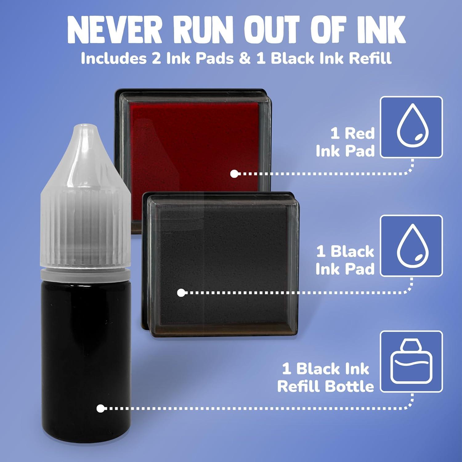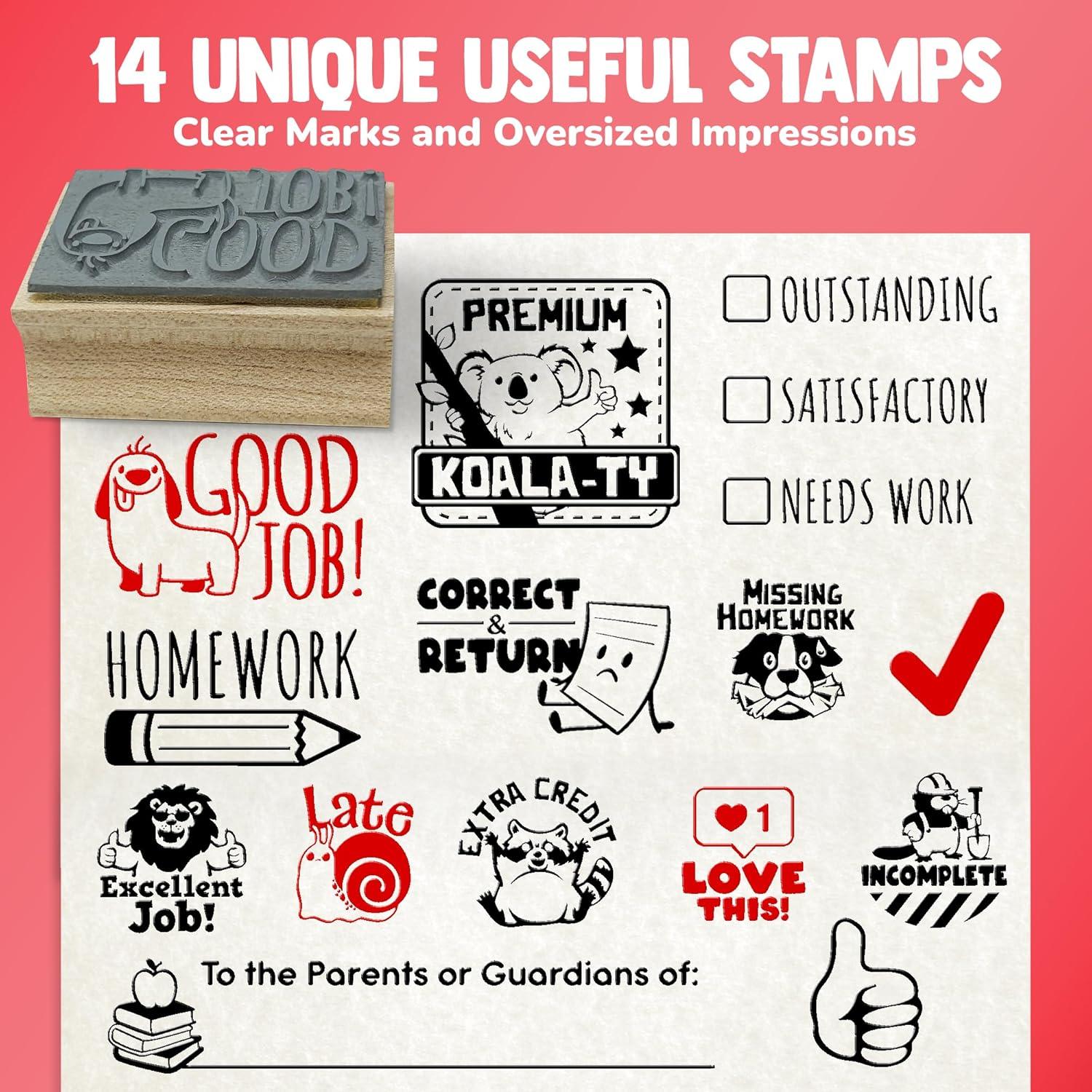 - You do so much — your stamps should, too. Bold, long-lasting impressions with every press. No more dried-up self-inkers or fed designs. This teacher stamp set includes two colorful ink ps in black and red.. as well as an ink refill! Whether you're using gring stamps for teachers, fun stamps, or homework stamps for teachers, we make it easy to give clear, confident feedback all year long.
